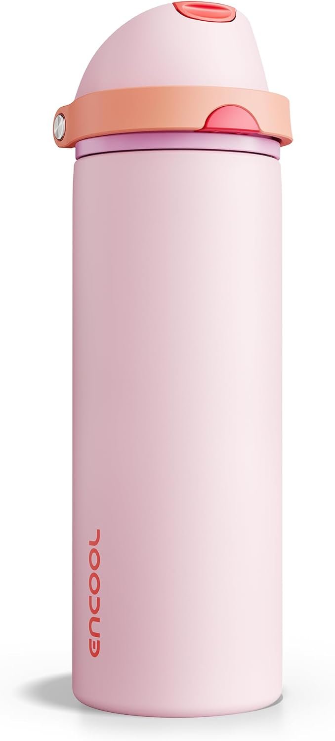 Insulated Water Bottle with Straw – Encool Stainless Steel Water Bottle with Push Button Lid, Leak-Proof & BPA-Free, Keeps Cold for 24 Hours for Sports, Travel, Gym (24 oz, Lily-Red)