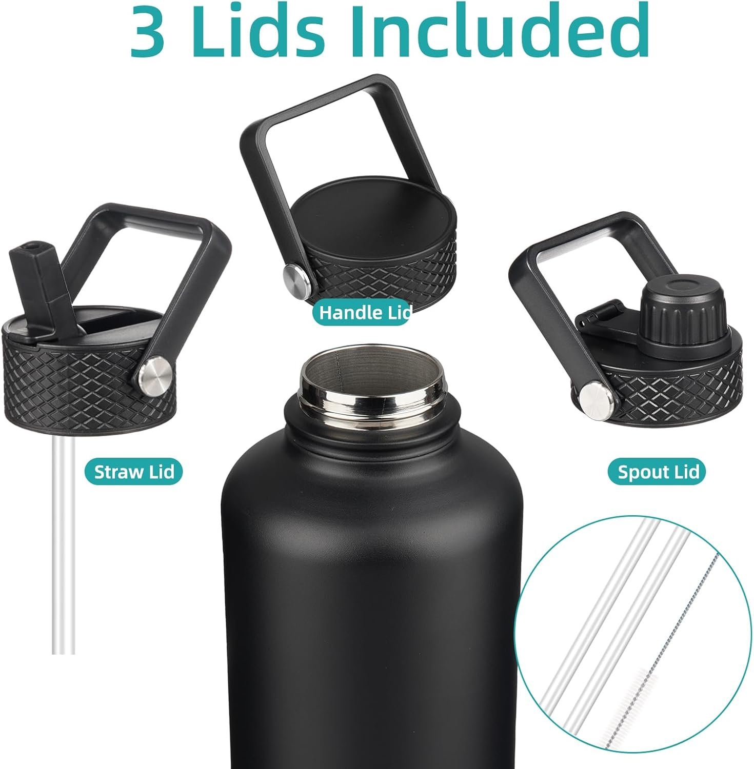 The water bottle comes with 3 lids for different beverages, a sip lid for hot drinks, a straw lid for iced beverages, a flex-removable lid(2 different handle lids ship at random) for smoothies or fruit drinks. All lids are BPA-free, leak-proof, and dust-proof, catering to your need