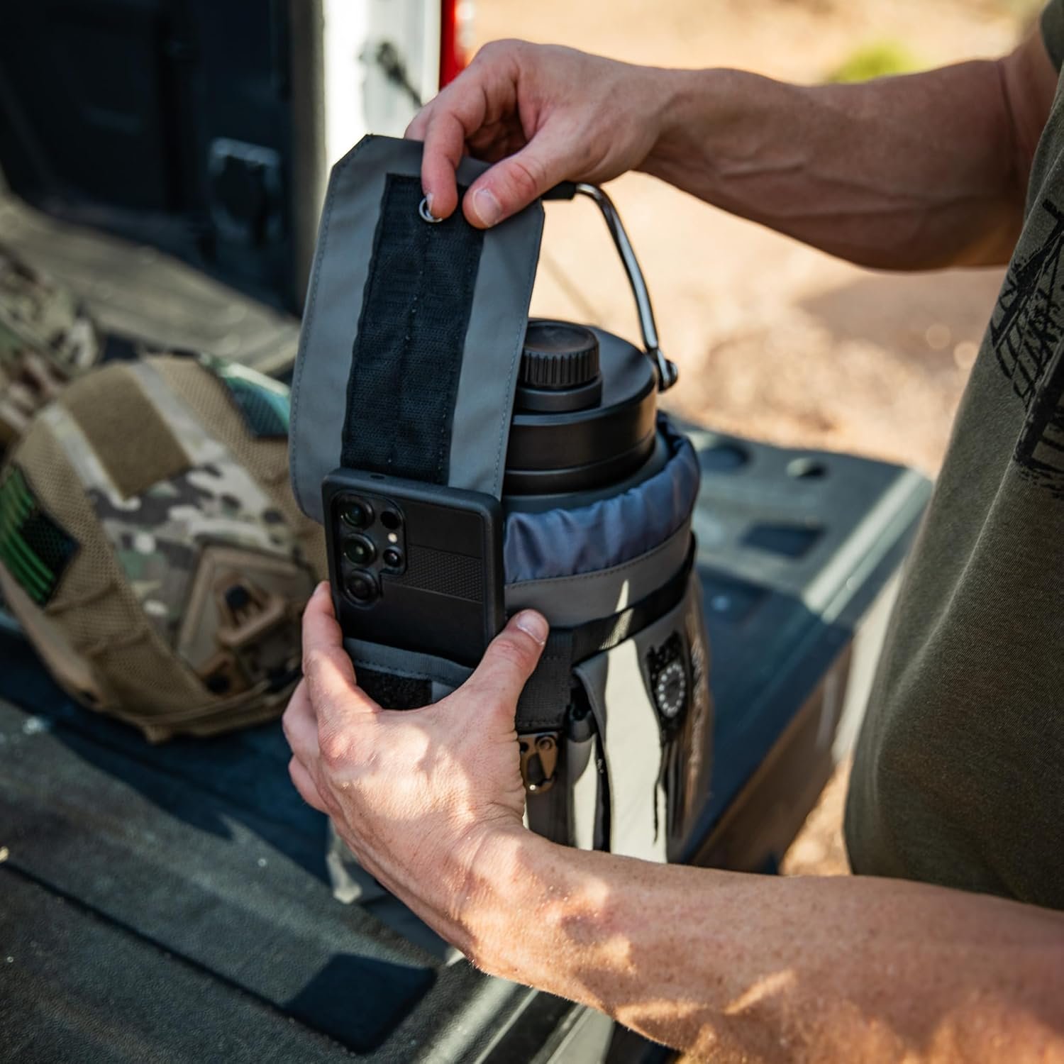REMOVABLE COVER – Made from military grade rip and tear resistant fabrics. The nylon cover is removable, washable, and has two extra large utility pouches for your cellphone, wallet, keys, and other EDC gear. Also includes a side grip carry handle for a comfortable hold when drinking.