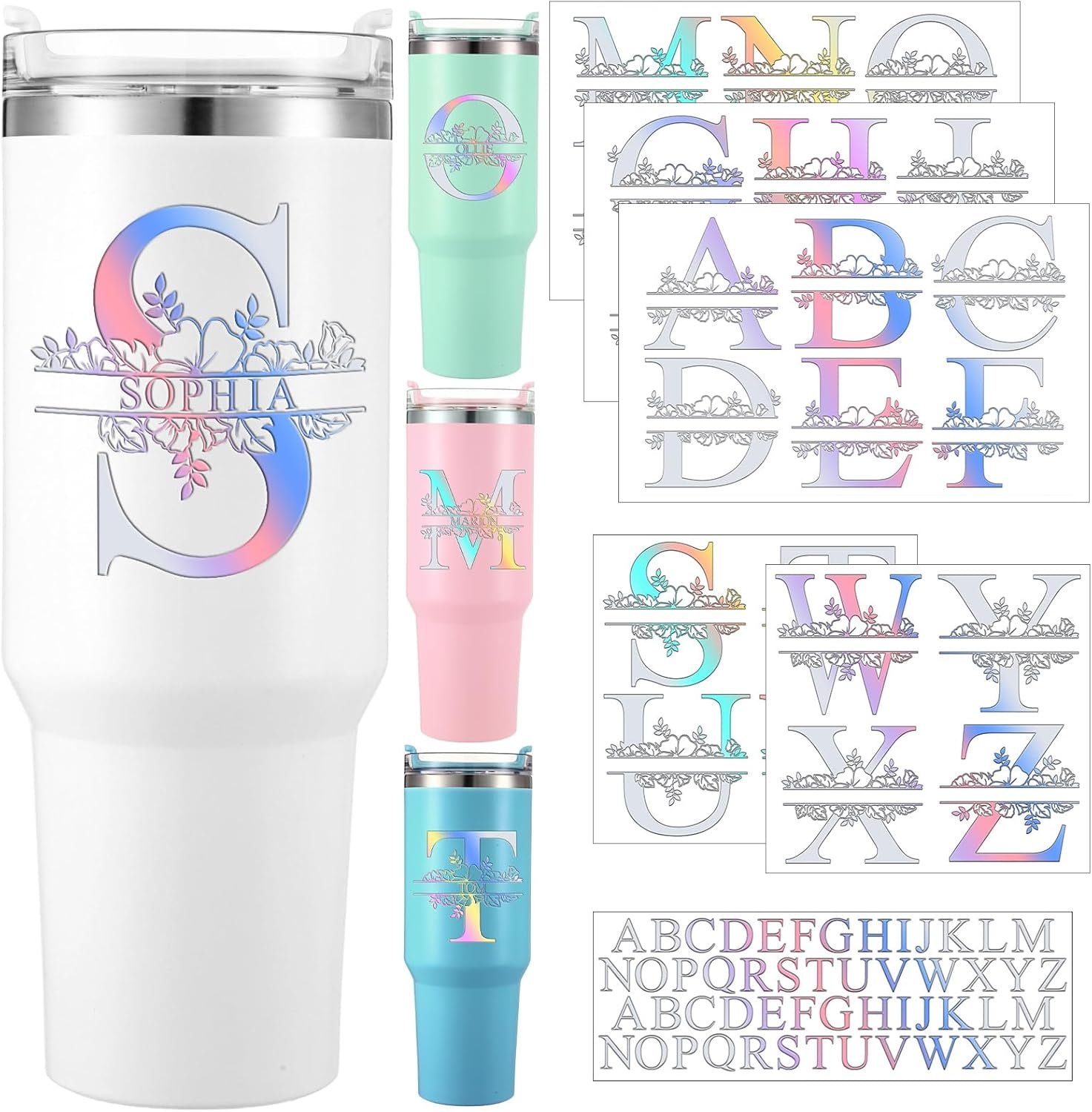Janlaugh 10 Sheets Waterproof Split Letter Stickers Personalized Name Stickers for 30 40 oz Tumbler Water Bottle Floral Monogram UV DTF Cup Wraps Alphabet Letter Decals for Glass Cup Laptop(Laser)