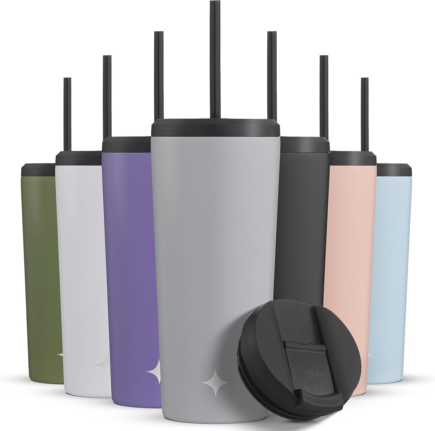 WITH TWO TUMBLER LIDS! Each slim cup you order comes with a Straw Lid, Flip Lid AND two tumbler straws! So you’ll always have the right lid for a hot or cold drink. These blank tumblers feature the JoyJolt icon, but free from giant logos in a range of colors, so it becomes YOUR own insulated cup.