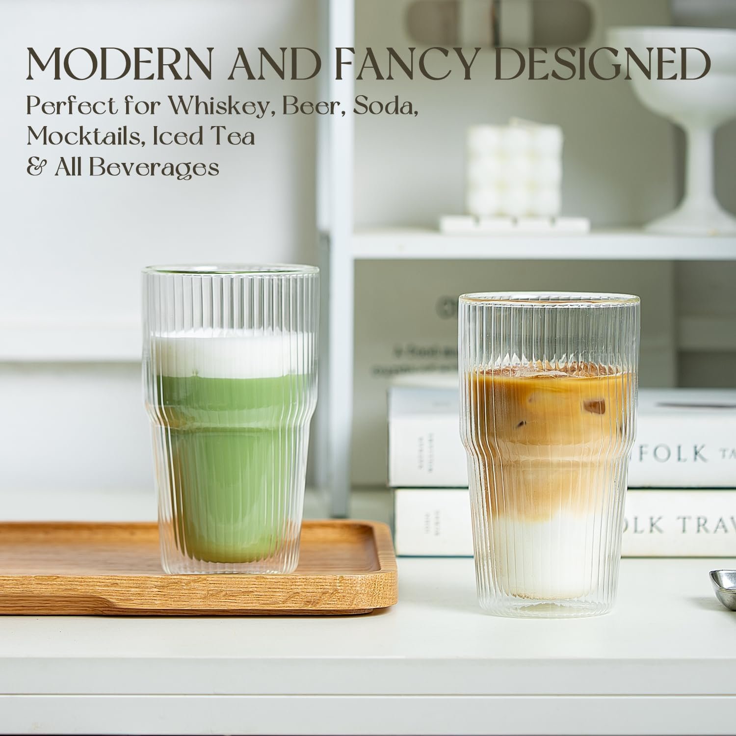 ELEGANT STRIPED DESIGN & CRYSTAL CLEAR CLARITY Featuring a beautifully textured striped pattern, these glasses add a touch of modern elegance to your table. The pristine, crystal-clear glass beautifully showcases the colors and layers of your craft cocktails, iced coffees, or fruit-infused waters, making every drink visually appealing.