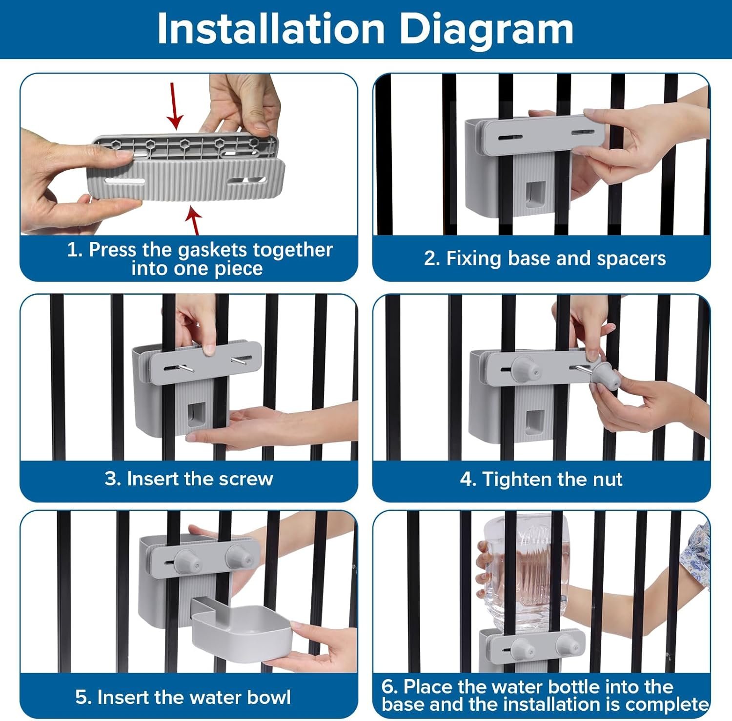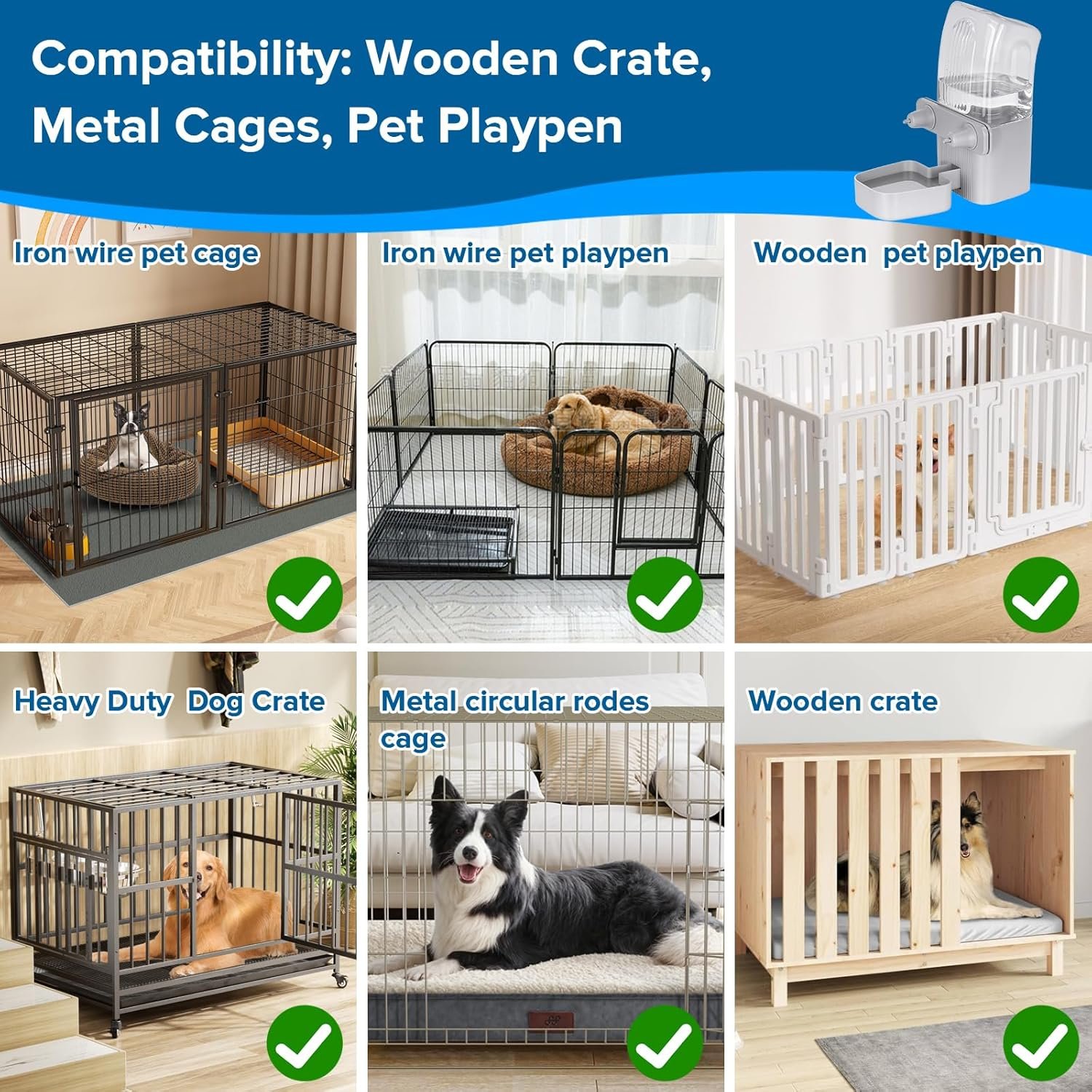 Cage Compatibility: This pet water dispenser is suitable for Heavy Duty Crate,Iron wire pet cage or Metal circular rodes cage,Iron wire pet playpen and Wooden crate.The Width range: 1.2 inches -5.2 inches, minimum height: 1.3 inches (> 1.3 inches).