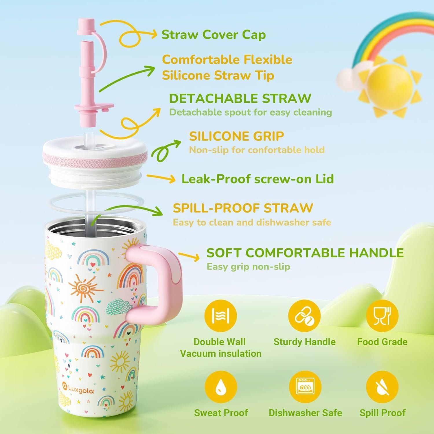 CUSTOMER SATISFACTION: Splash-proof lid, strong build, and fun designs make this insulated cup ideal for active kids. We care about your satisfaction! If you experience any issues with your Luxgola product, please reach out to us for assistance