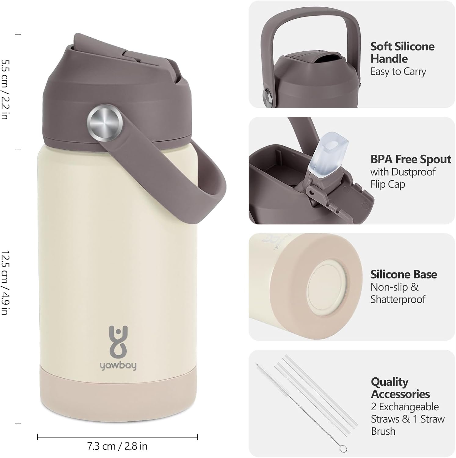 Kids Insulated Water Bottle with Straw Lid & Silicone Handle,12oz Kids Leak Proof Water Bottle for School Boys Girls,Double Wall Vacuum Stainless Steel with Non-slip Silicone Base(Beige)