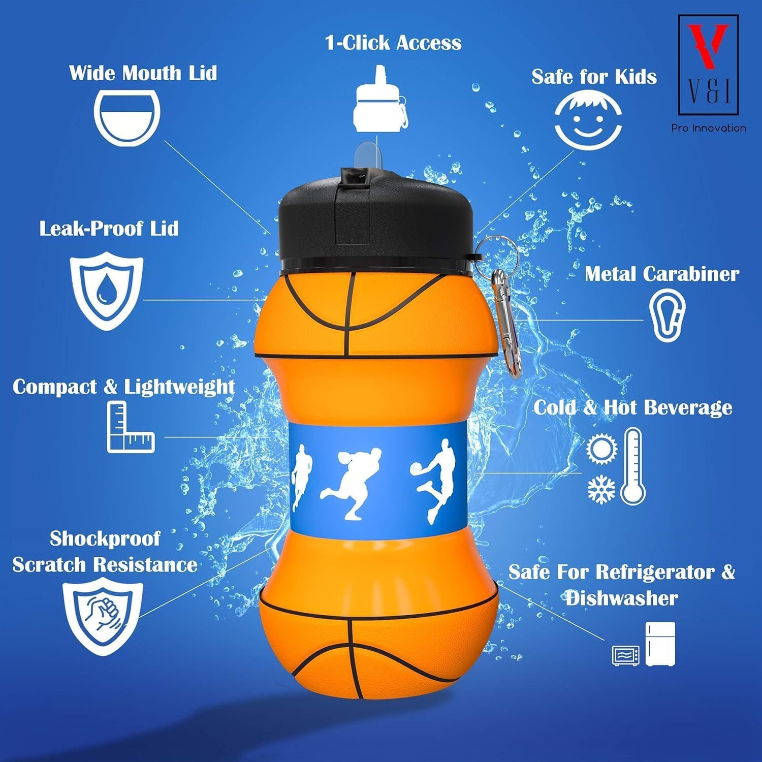 Kids Sports WaterBottle Collapsible Ball Shaped Drinking Cup Leak Proof School Lunch MugShockproof Squeezable Basketball Soccer Baseball Football Champion Team (Orange, Black and Blue)