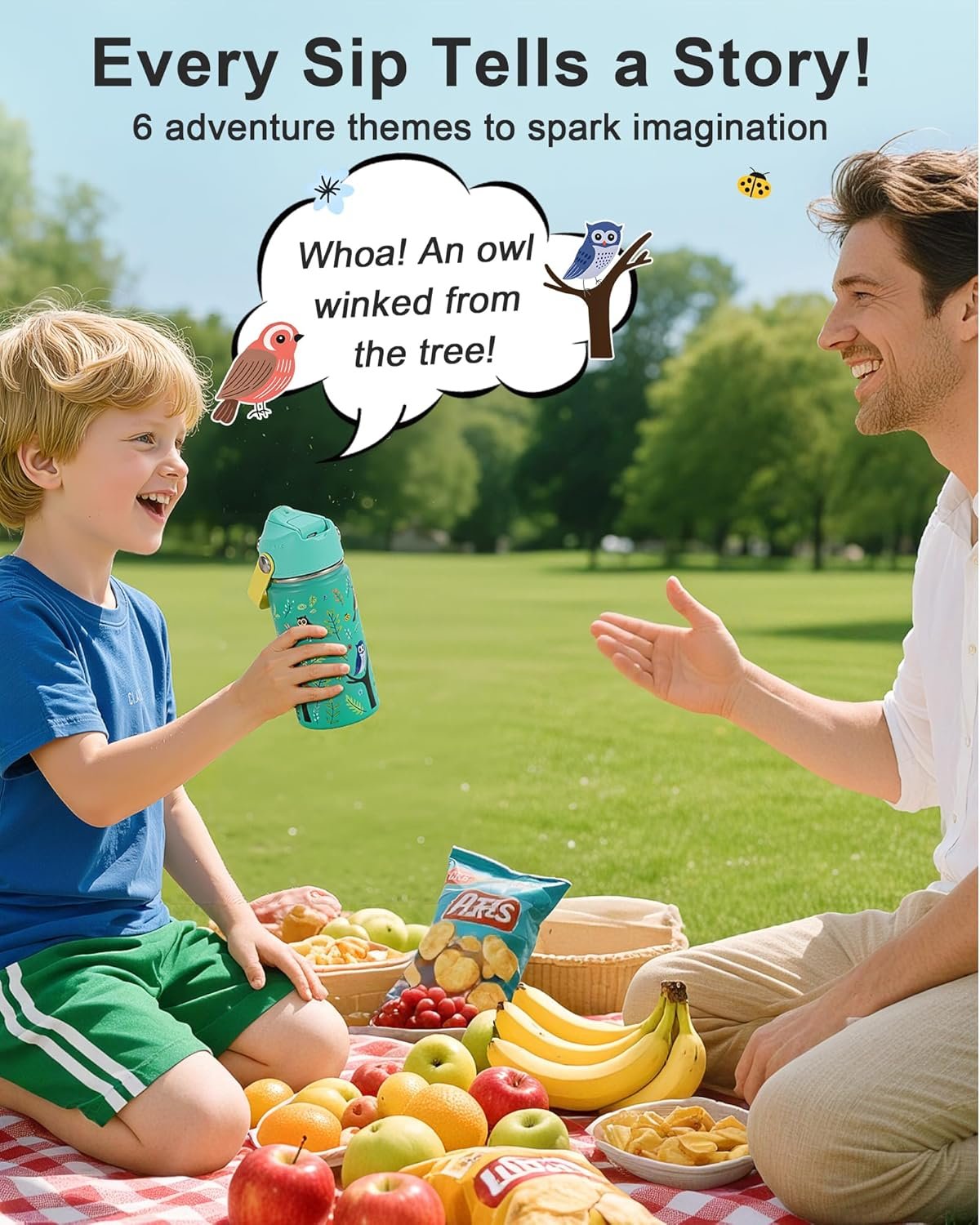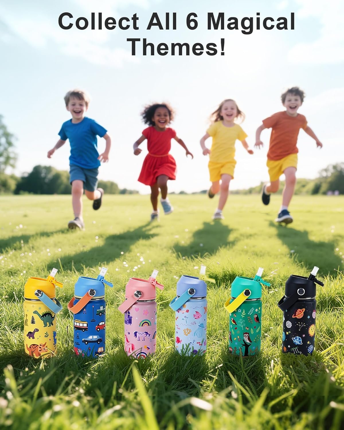 Cute Cartoon Prints Spark Creativity: Choose from cars, universe, dinosaurs, unicorn, undersea worlds, and more! Vibrant prints turn hydration into storytelling time, boosting visual development and drinking interest, perfect kids water bottle 14 oz for boys and girls.