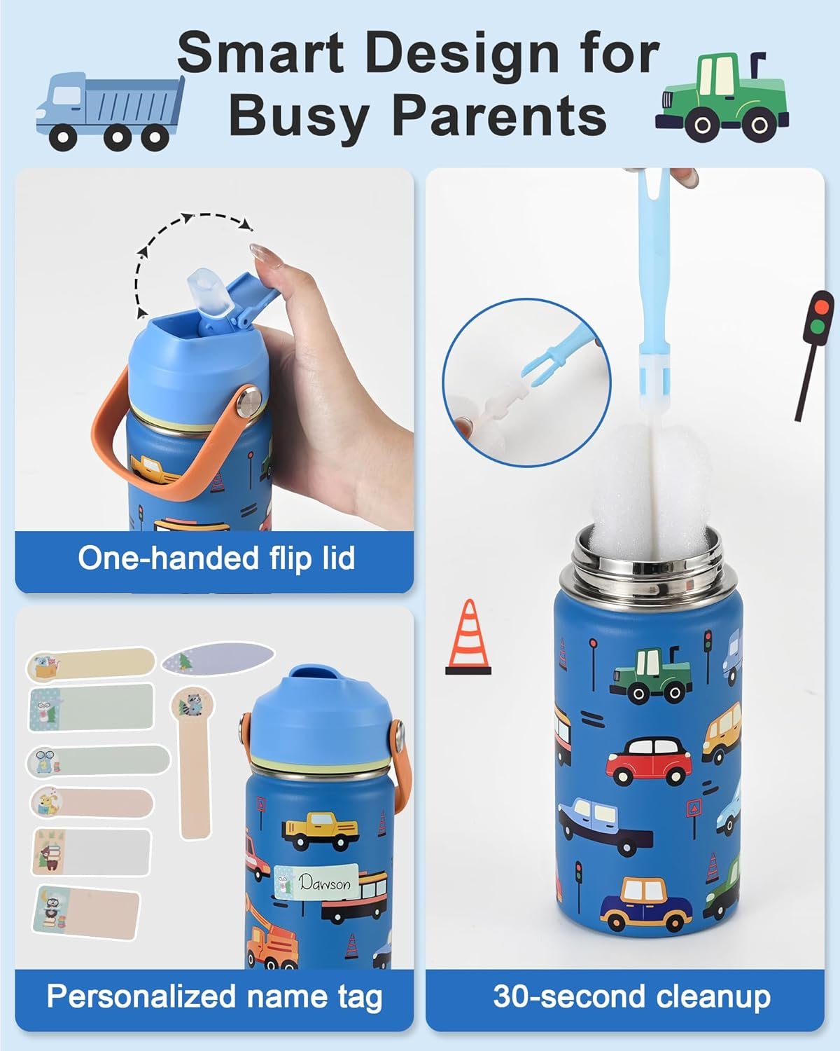 Kids Water Bottle 14oz with Silicone Straw Lid – Insulated Toddler Water Bottle Stainless Steel Keeps Cold 24H, Leak Proof & Cars Trucks Prints Design | Custom Name Tag for School, Daycare, Travel