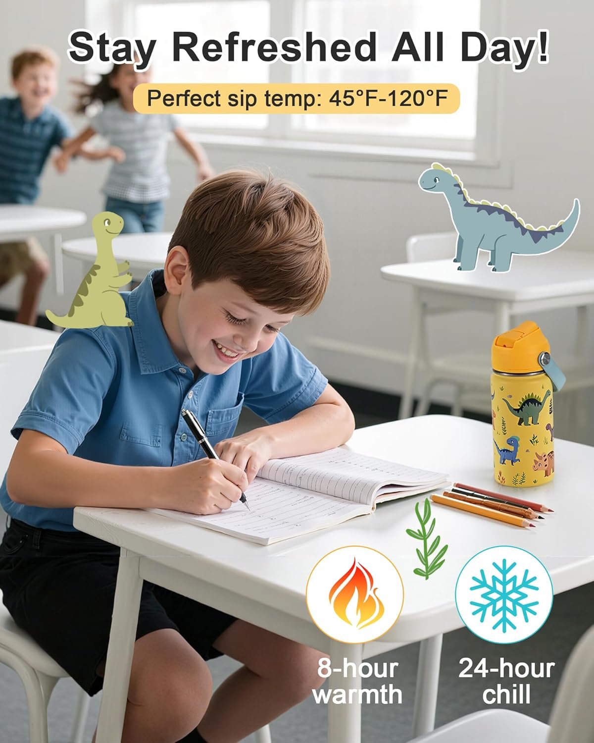 24-Hr Cold, 8-Hr Hot Drinks: Double-wall vacuum insulation of this stainless steel toddler water bottle keeps juices icy cold for 24 hours and soups warm for 8 hours. Safe sip range (45°F–120°F) ensures no burnt tongues!