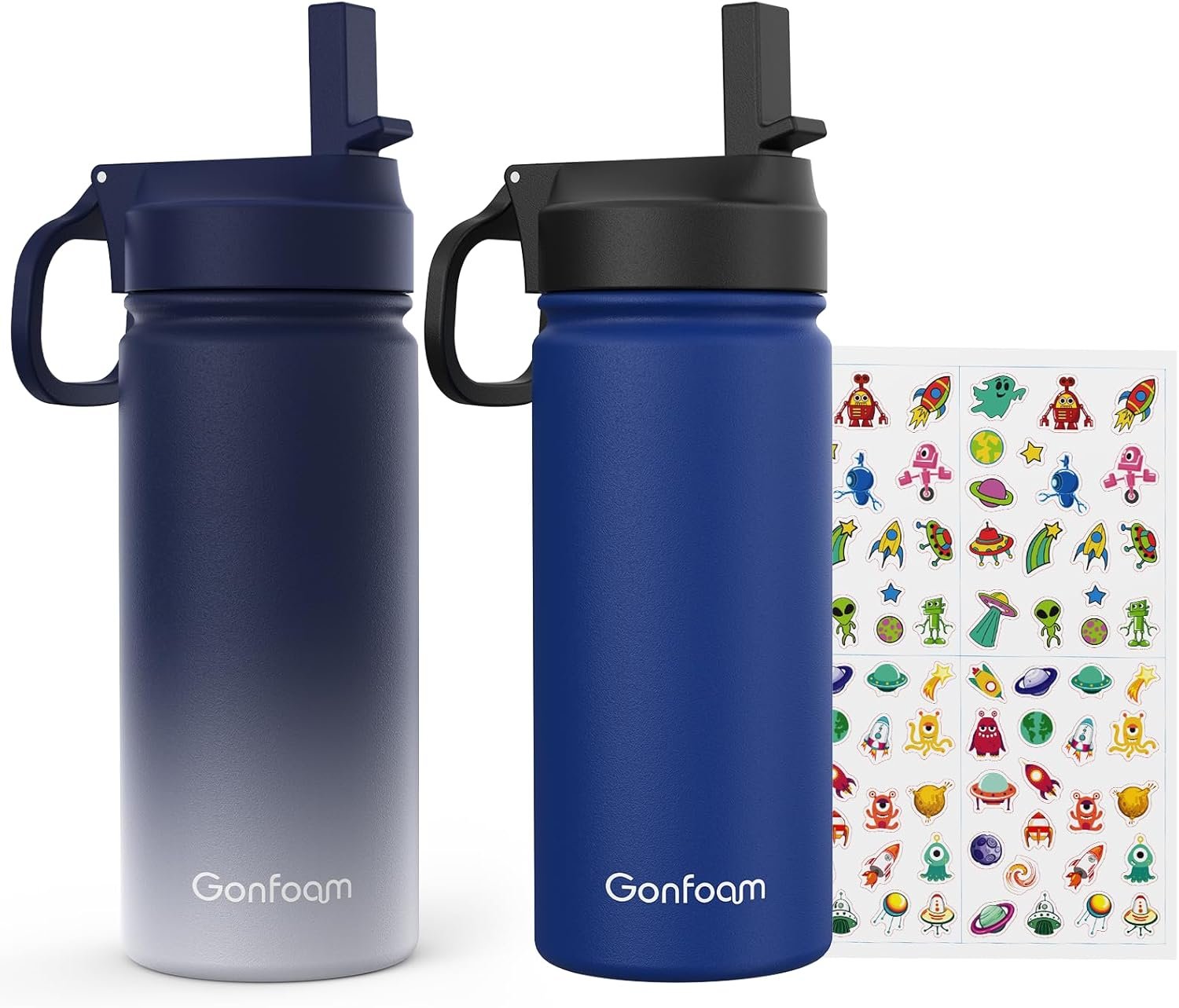 Kids Water Bottle, 2-Pack 16oz Kids Water Bottle with Stickers for School, insulated Stainless Steel Straw Cup(Sapphire+Gray)