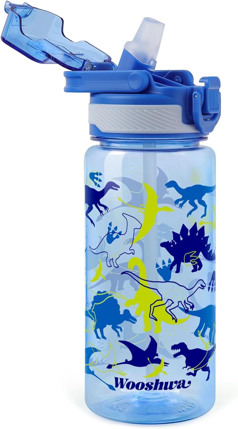 Kids Water Bottle for School, 20 Oz Plastic Straw Water Bottle with Silicone Spout and Leakproof Cover, Dishwasher Safe (Dinosaur)