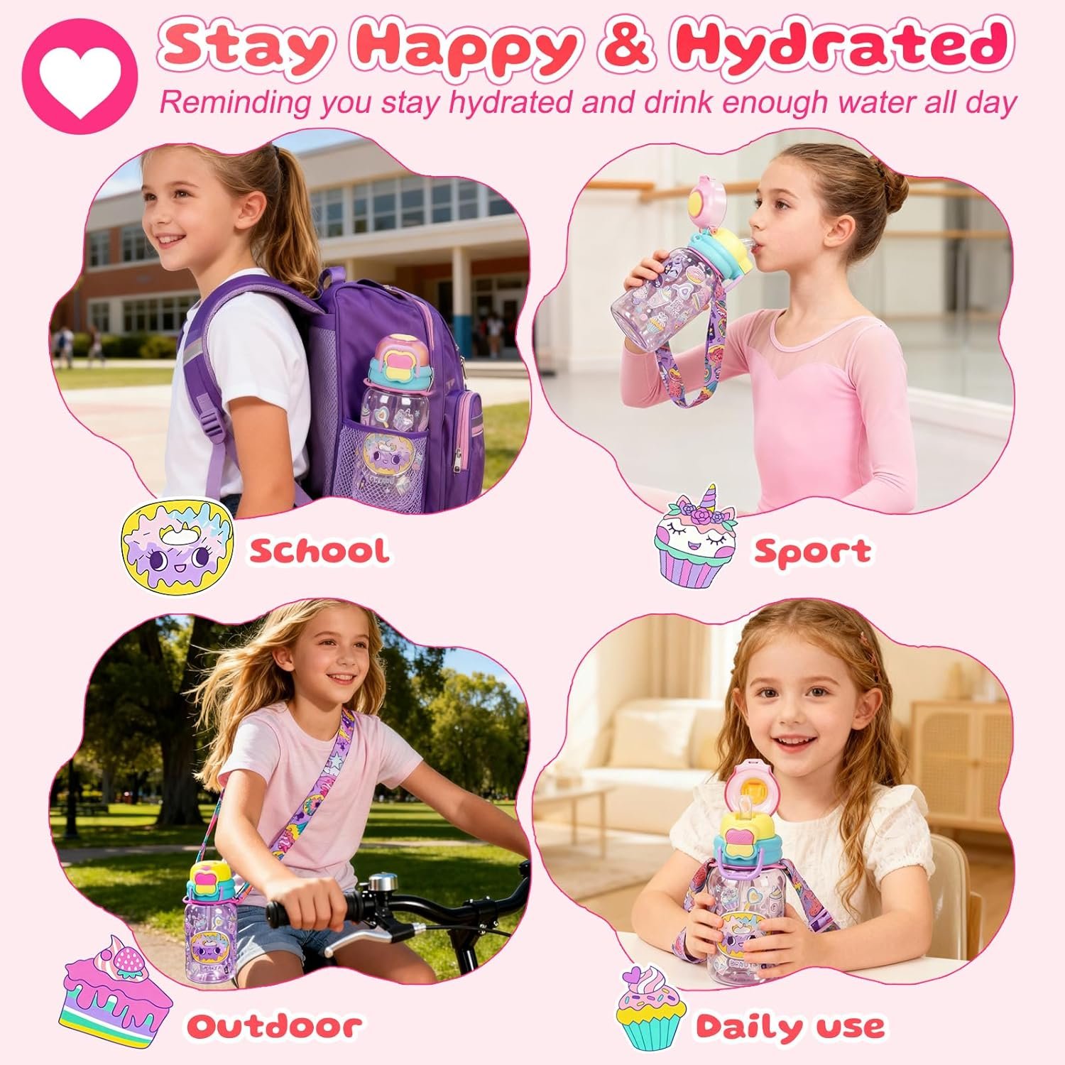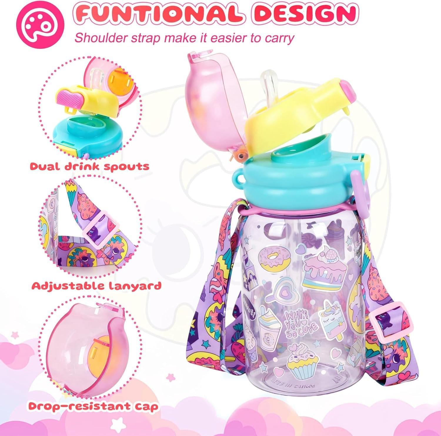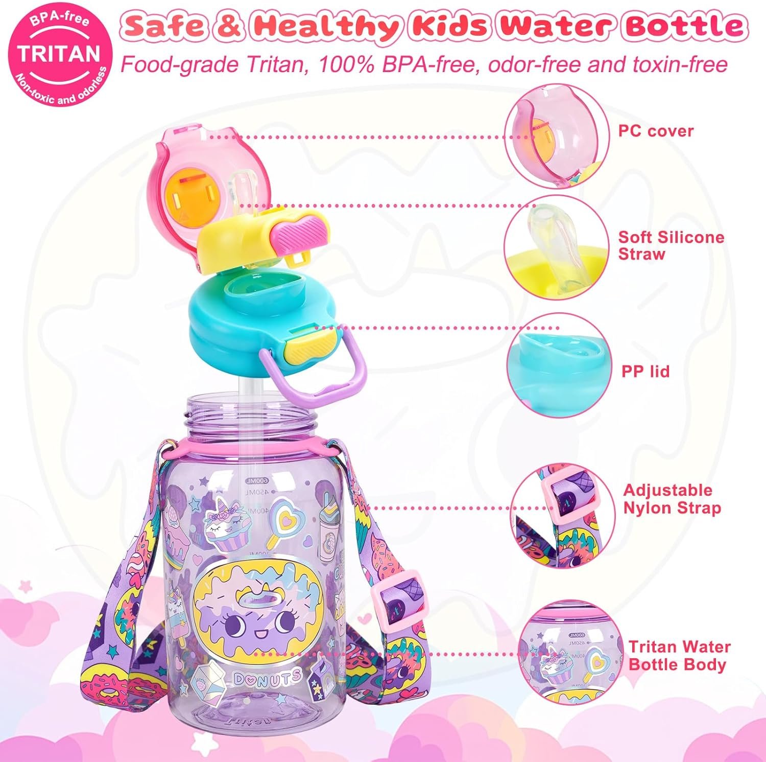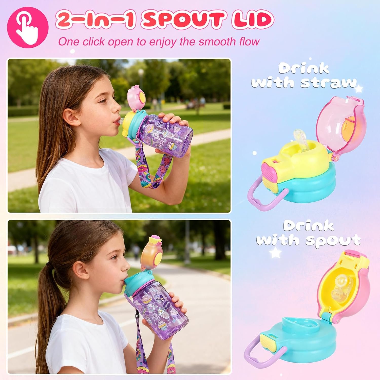 Kids Water Bottle with Pop-Open Straw & Spout 2-in-1 Lid, 20oz Leak-Proof Tritan Plastic BPA-Free Kids Cup with Strap for School Travel Sports Girls Toddler, Dessert