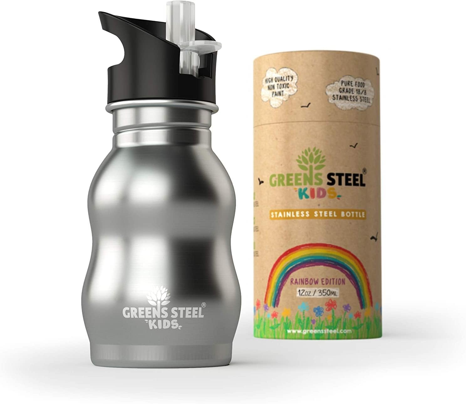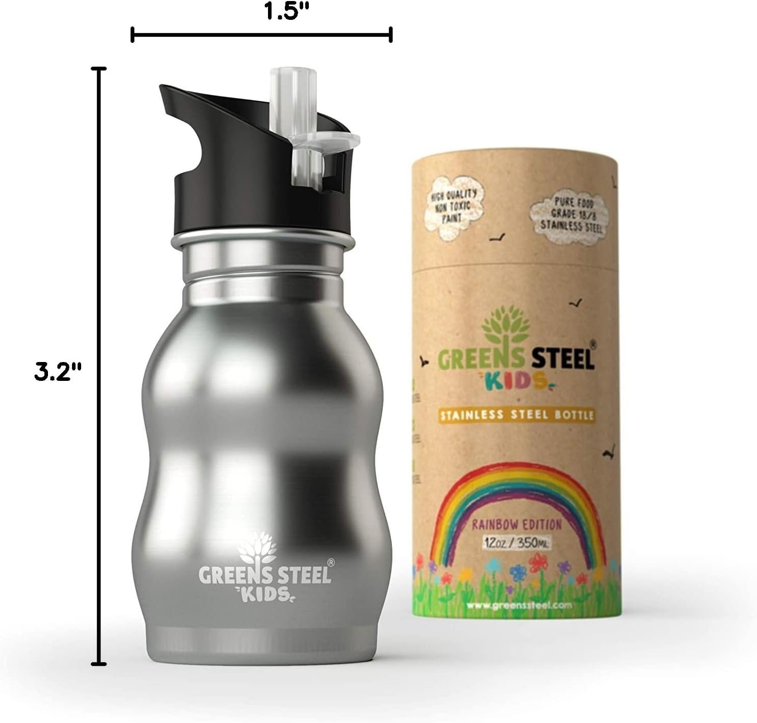 Kids Water Bottle with Straw & Handle, 12 oz Silver- Eco Friendly Toddler Cups with Straws – Easy Sip Metal Water Bottle for Kids – Cute Stainless Steel Water Bottles for Children – Leak Proof Lid