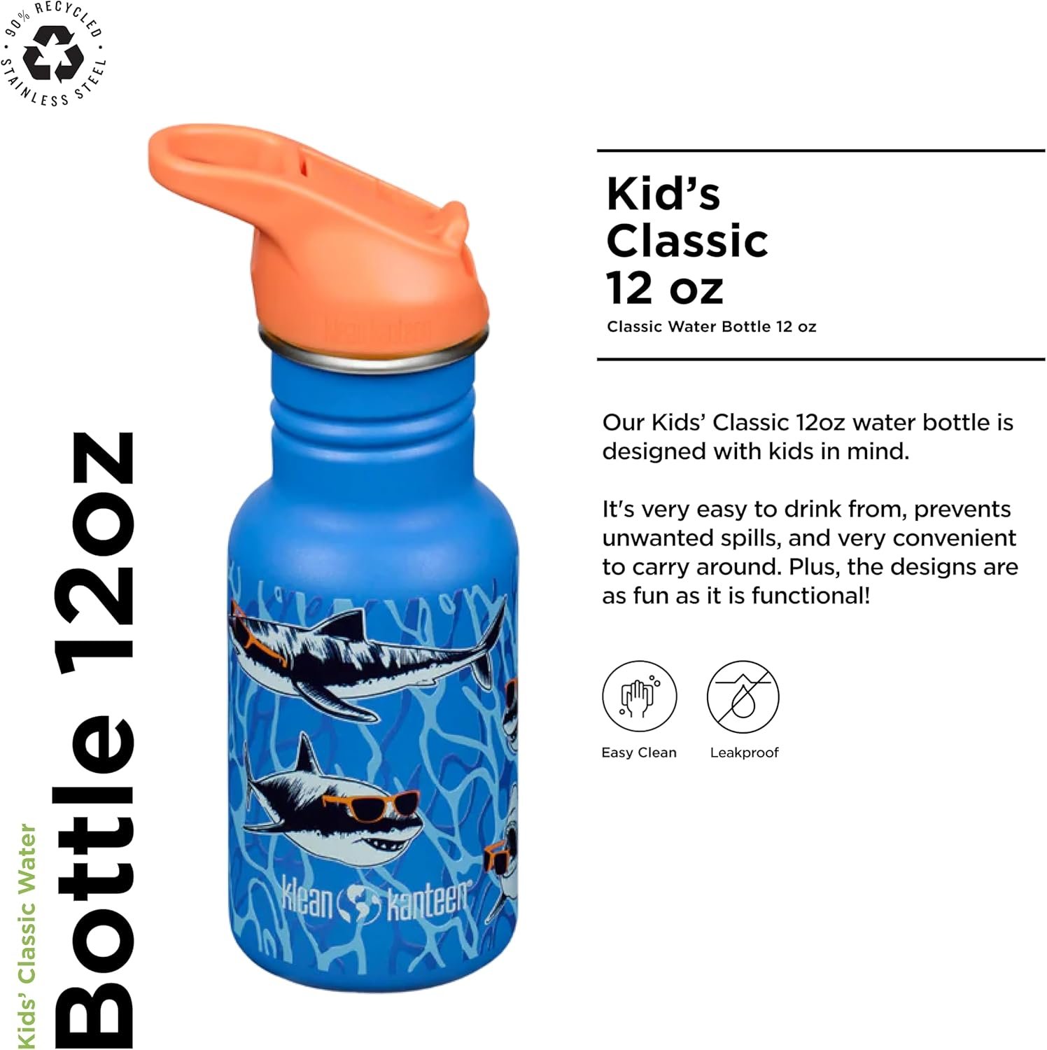 Klean Kanteen 12 oz Classic Kid’s Water Bottle with Flip Seal Sport Cap & Straw – 100% Leakproof Cap – Durable Stainless Steel Material – Lightweight & Easy-Grip – BPA-Free – Sharks in Shades