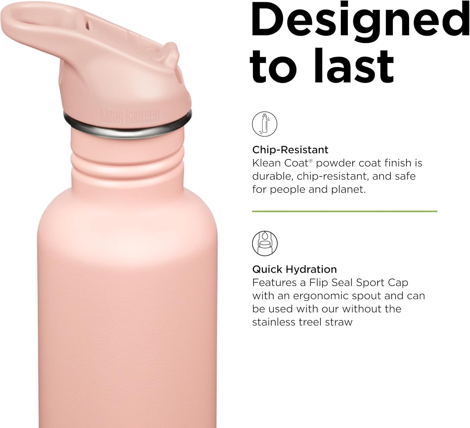 Klean Kanteen 27 oz Classic Water Bottle with Flip Seal Sport Cap & Straw – 100% Leakproof Spout & Cap – Durable, BPA-Free & Stainless Steel Material – Easy-Sip Water Bottle – Peach Parfait