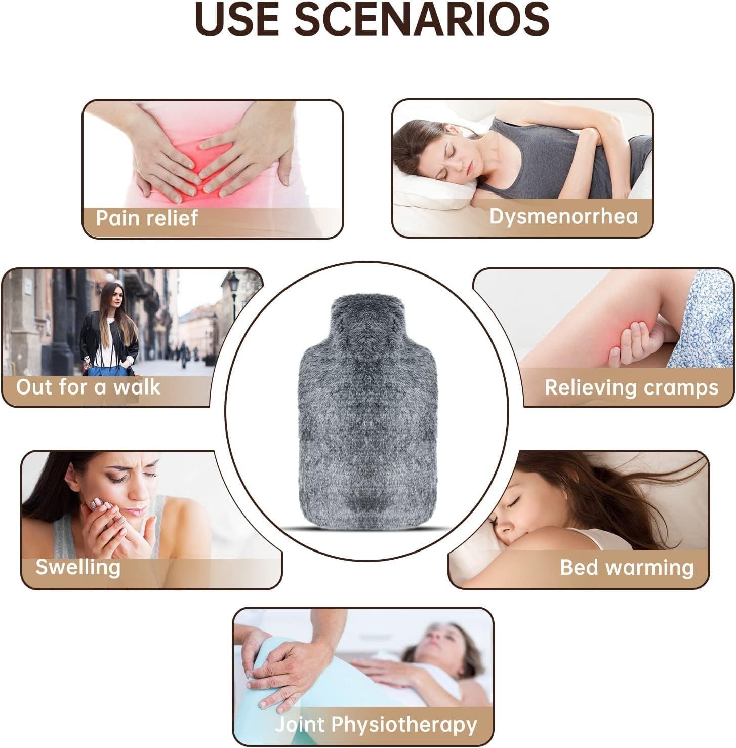4. DO NOT close directly it to the body for a long time for fear of scald. Do not fall a sleep with a hot water bottle.