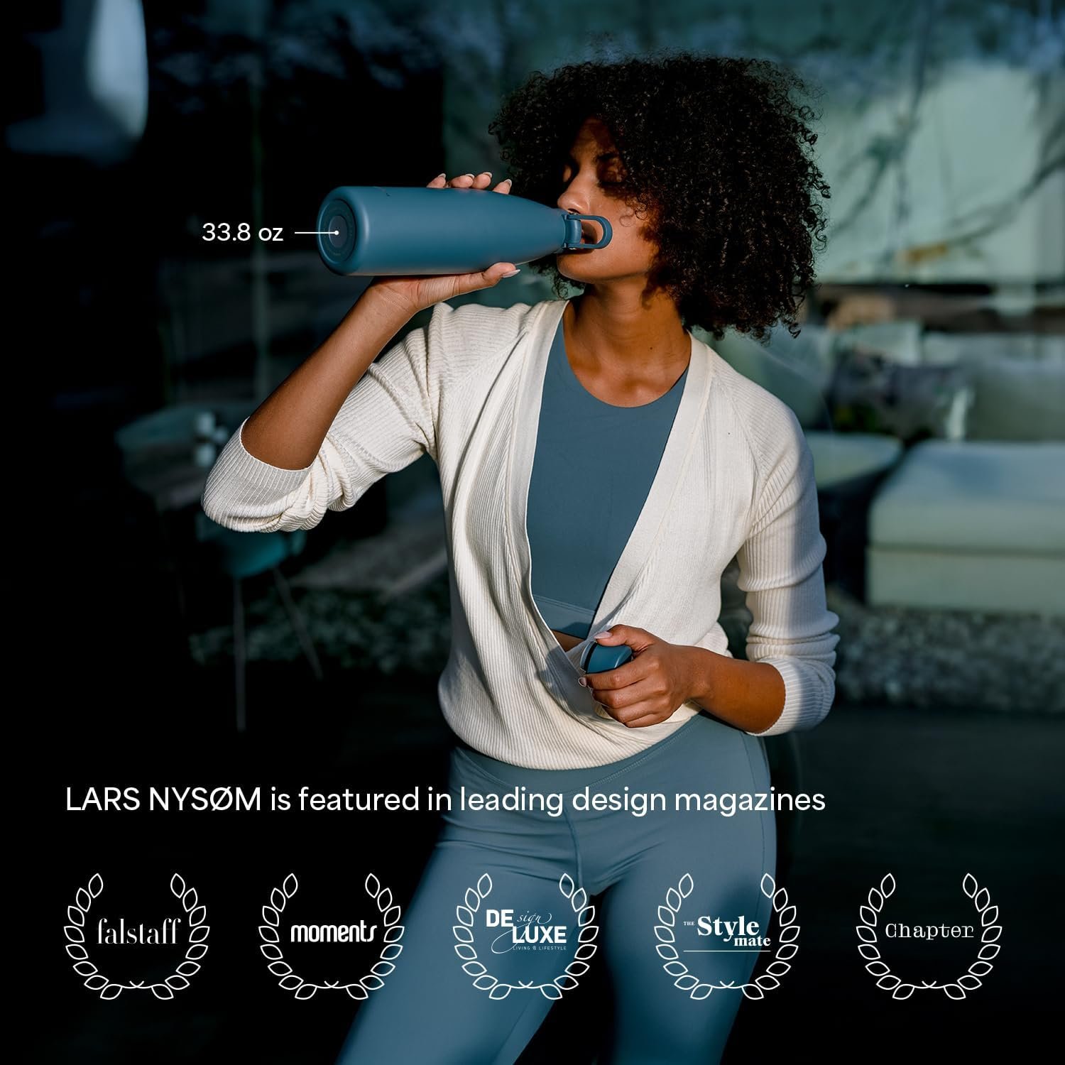 FUNCTIONAL DESIGN: Our Stainless Steel Drinking Bottle “Nåde” by LARS NYSØM is the reusable alternative to plastic bottles. Height: 12 In, Ø 3.2 In, Vol.: 34 oz, Weight: 0.95 lbs. Perfect for office, yoga, fitness or car.