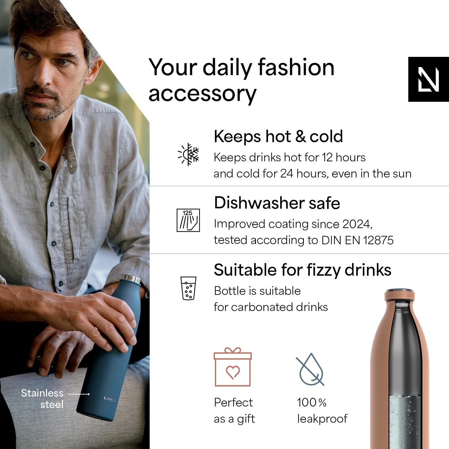 Yes, LARS NYSØM “Ren” bottles are dishwasher-safe. Since 2024, the bottles have an improved coating, tested according to DIN EN 12875 (125 washes).