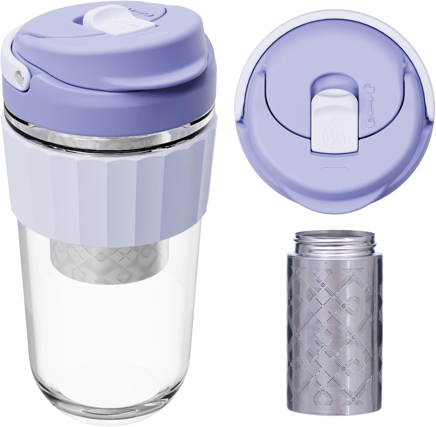 Leak-proof Glass Coffee Mug with Lock Lid, 17oz Reusable Coffee Cup with Stainless Steel Filter, Travel Tea and Fruit Infuser with Handle, BPA-free, Dishwasher Safe (Lavender)
