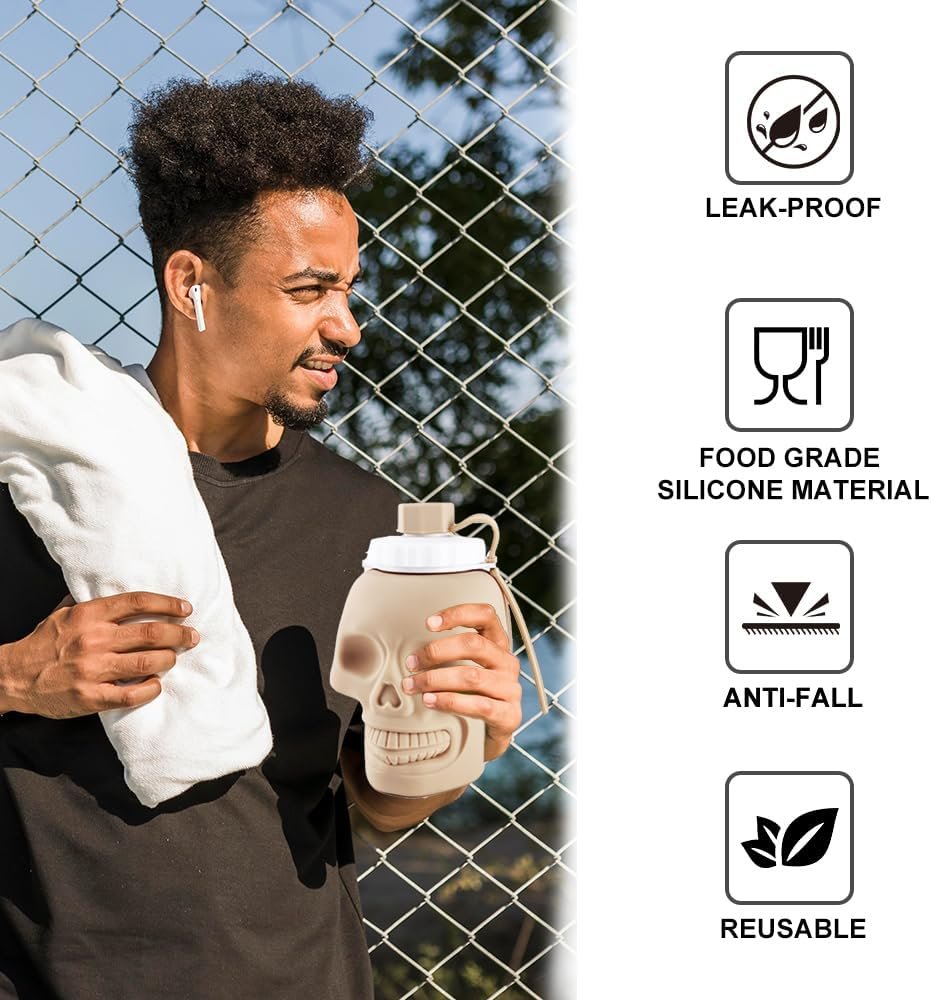 【Unique skull design and high-quality silicone】This foldable water bottle is made of food grade silicone and has a strange skull shape. It does not contain bisphenol A, is durable, ensures safe hydration, and stands out with its eye-catching design, making it perfect for sports, travel, or daily use.