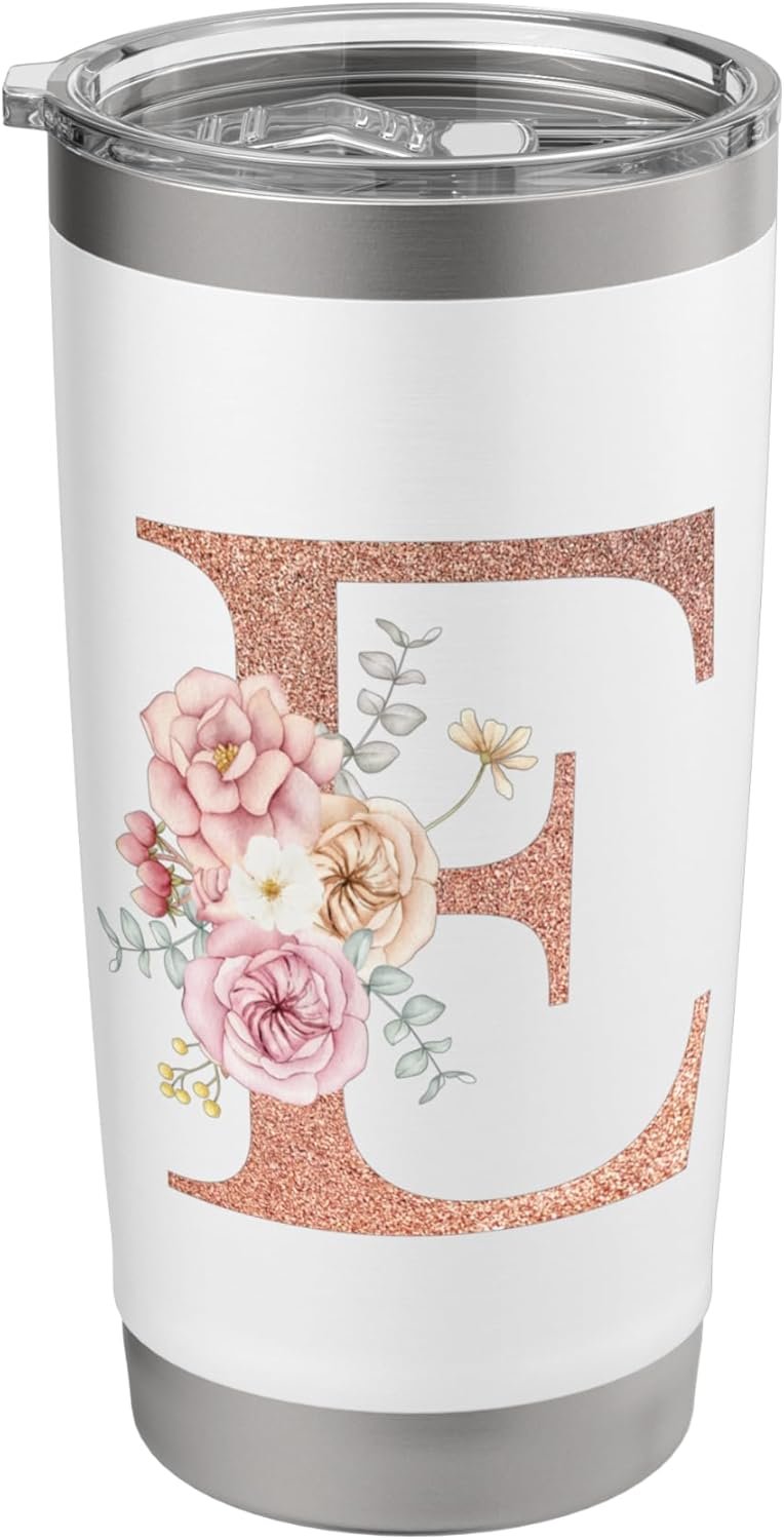 Letter E Initial Floral monogram Travel Coffee Cup Mug Stainless Steel Insulated Tumbler