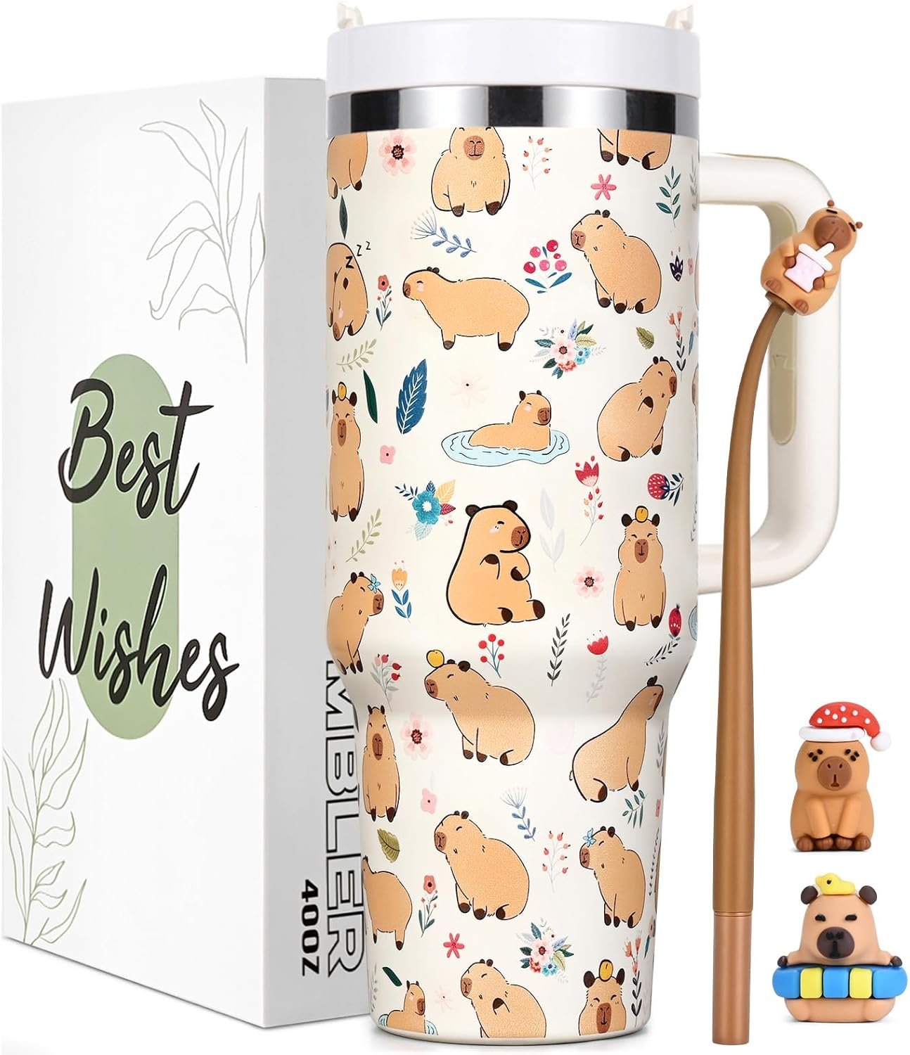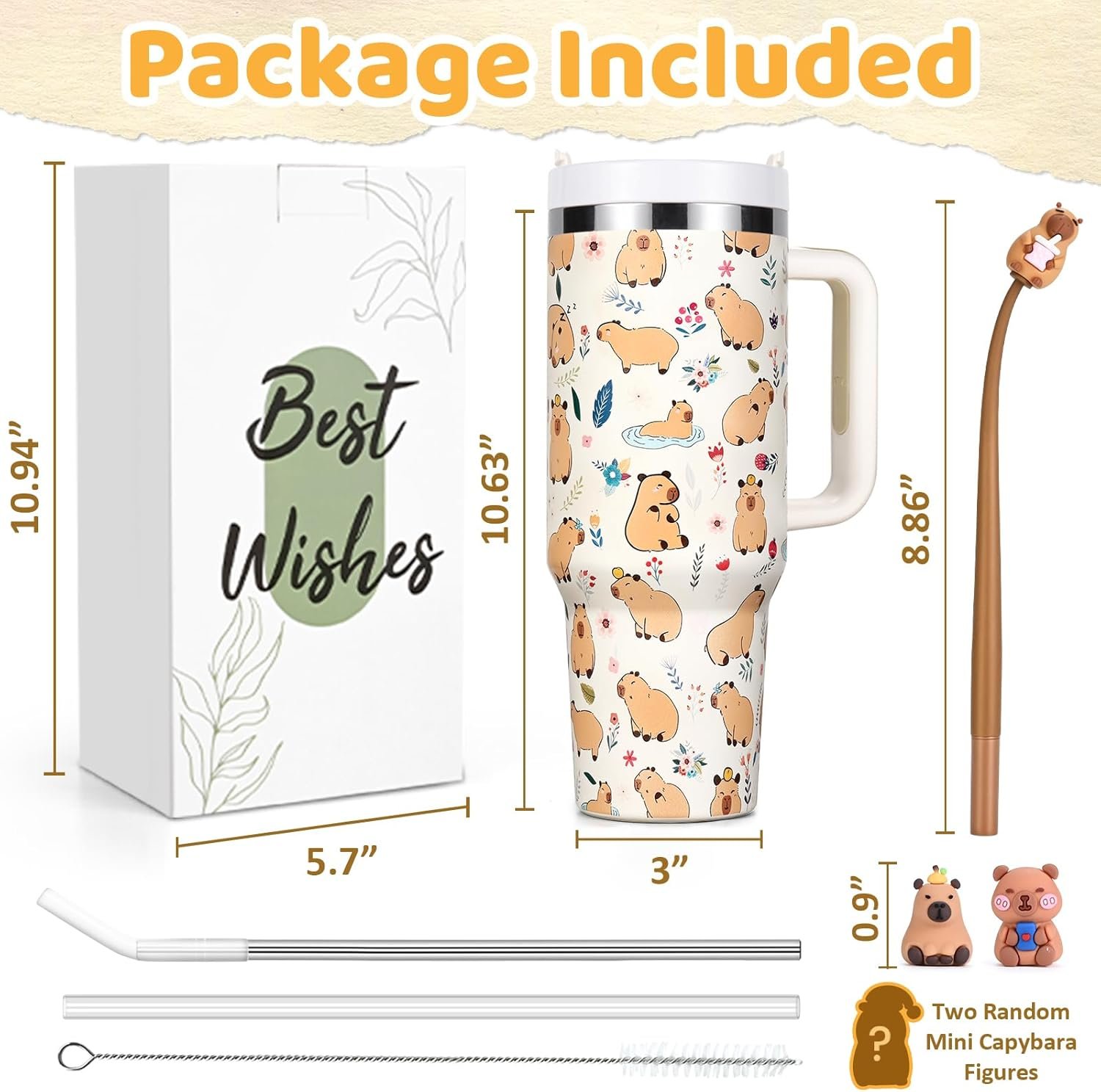 Perfect Capybara Gifts Set: Our capybara gifts set comes with 40oz capybara tumbler, two mini capybara Figures(Random), a bobblehead pen and a pack of stickers, as well as some accessories such as two straws, a straw brush and a cup brush. Express your sincere gratitude and best wishes to your friends with this perfect capybara gifts set