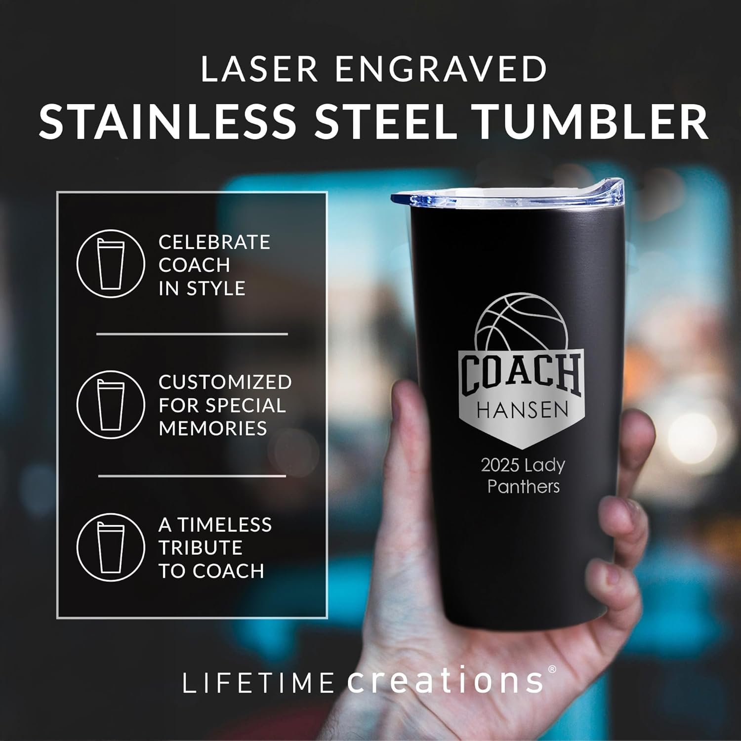 Lifetime Creations Personalized Basketball Coach Tumbler: Custom Basketball Coach Gift, Coaches Coffee Travel Mug from Team, Insulated Engraved Stainless Steel 20 Ounce Cup (White)