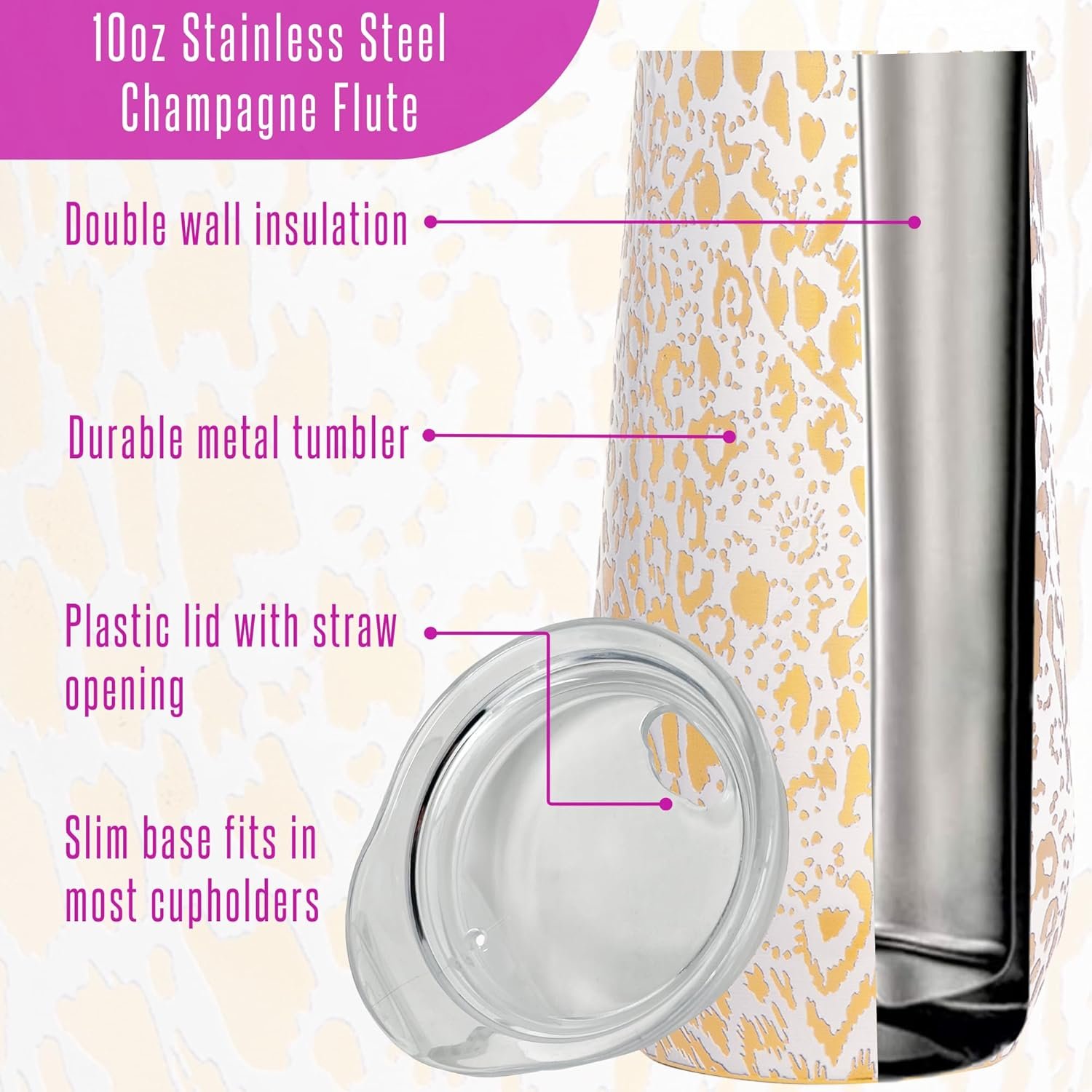 Stainless Steel Tumbler: Champagne flute features a double wall stainless steel design that offers insulation and works to keep the cup from sweating. The clear plastic lid securely seals to the cup with a silicone rim so you stay mess-free as you travel