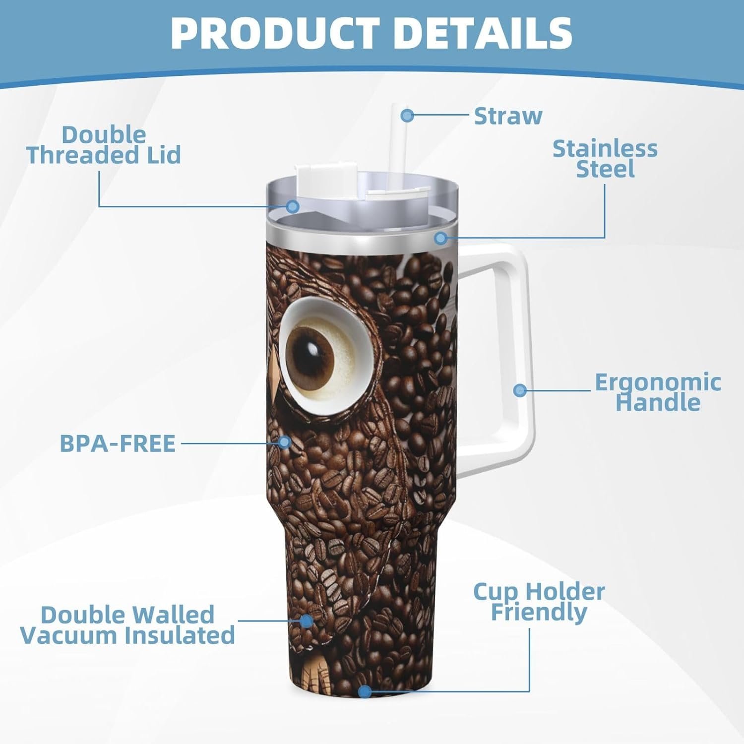 Fit Most Car Cup Holders: The Coffee bean owl tumblers come with a BPA-free, anti-leak flip lid to contain your drink and prevent spills. Designed to fit most car cup holders, they are perfect for travel, parties, camping, and sporting events