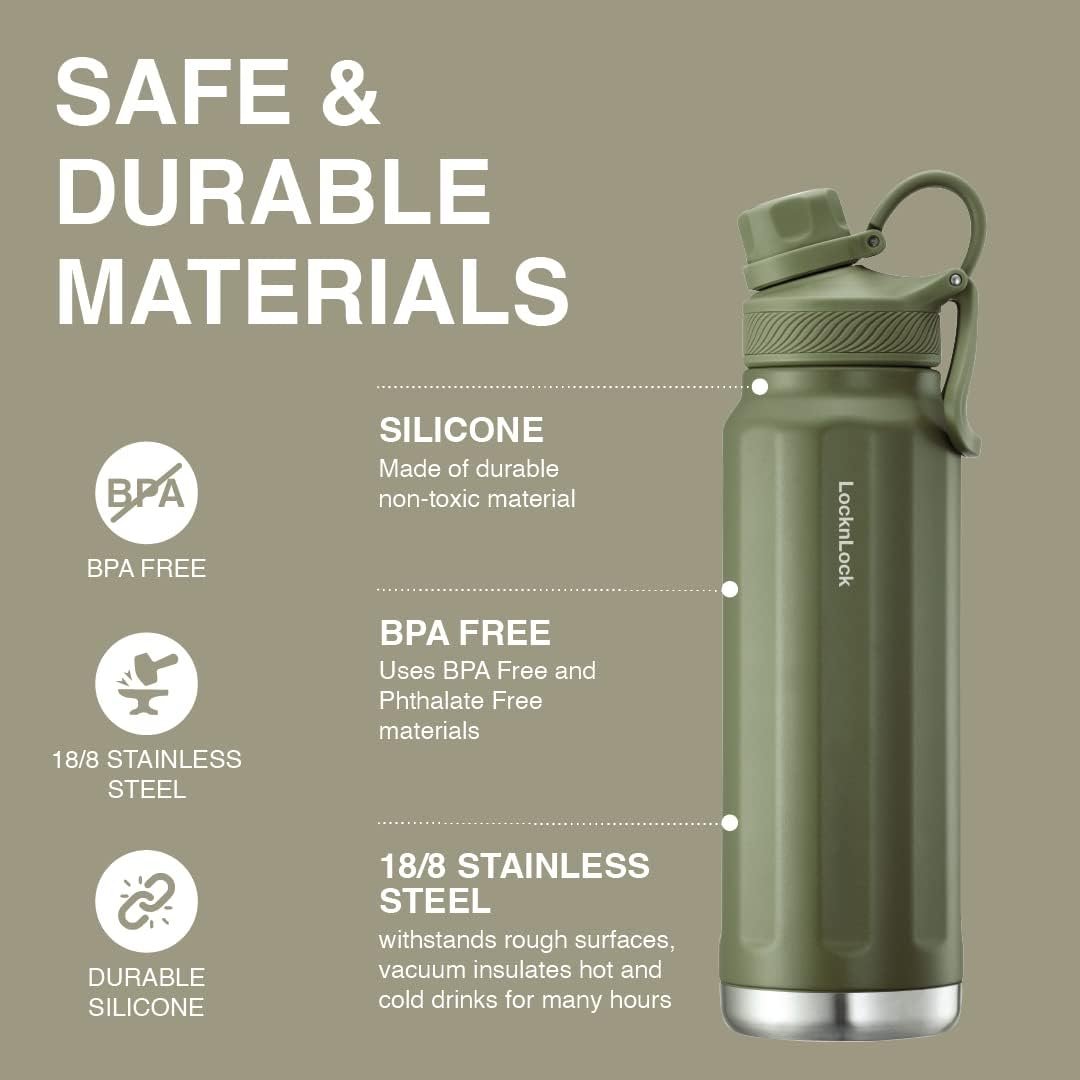 LocknLock LHC3252KKI Trek Water Bottle, Stainless Steel, Double-Wall Vacuum Insulated for Hot and Cold Drinks with Lid and Handle, Travel-Friendly, Leakproof, BPA Free, 32 oz, Olive Green