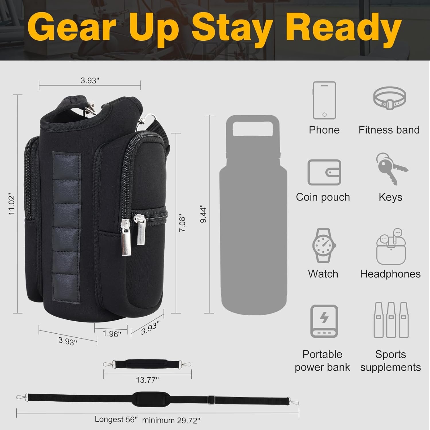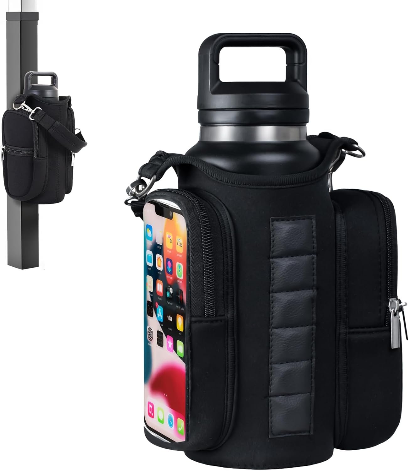 Universal Fit for Popular Water Bottles & Phones: Designed to fit most popular water bottles, including Hydro Flask, S’well, and YETI (18oz to 40oz), the water bottle holder offers versatility for your daily needs. The phone pocket fits large smartphones like iPhone 15/16 Pro Max and Samsung Ultra, so you can easily keep your fitness essentials within reach, no matter where you are