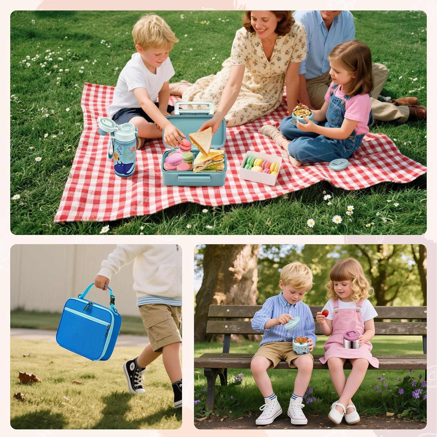 MAISON HUIS Bento Box for Kids with 8oz Soup Thermo, Insulated Lunch Bag & 17oz Water Bottle, 2-Compartment Bento Box with Built-In Ice Pack, Leak-Proof & BPA-Free