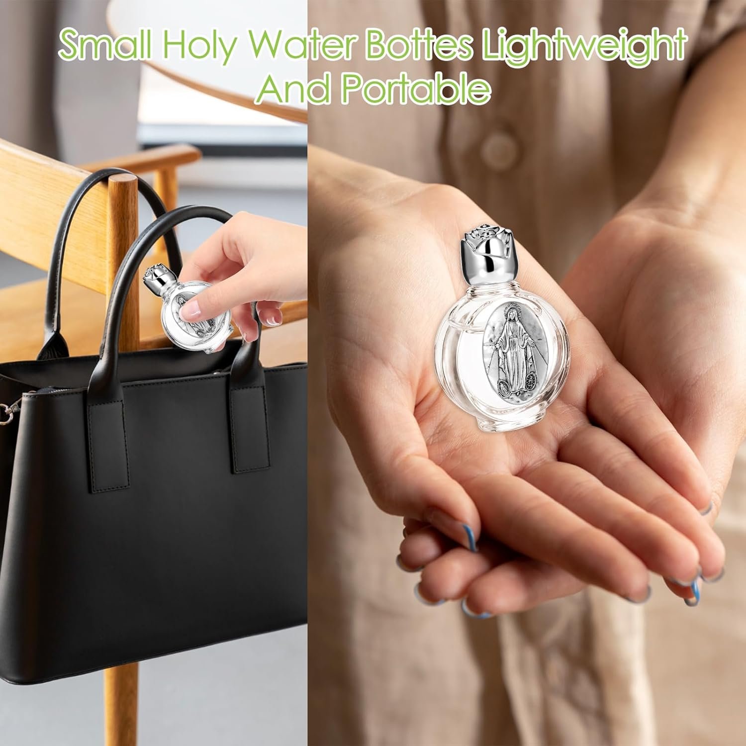 Mini Holy Water Bottle: measuring 2.5 inches tall by 1.8 inches wide by 1 inch thick, holds 0.5 floz of holy water; Small and lightweight, the holy water bottle is portable and easy to fill, fits in your handbag, and is suitable for travel