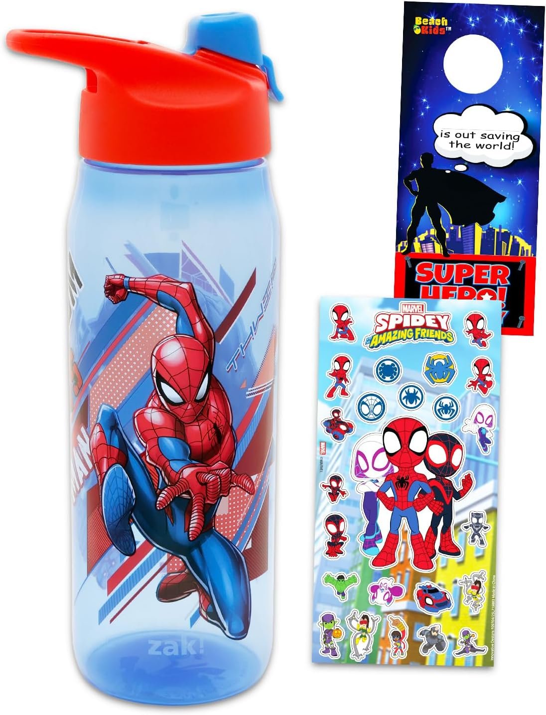 Officially licensed Spiderman merchandise. The Spiderman refillable water bottle also comes with Spidey and Friends stickers and a Rex-Man door hanger.