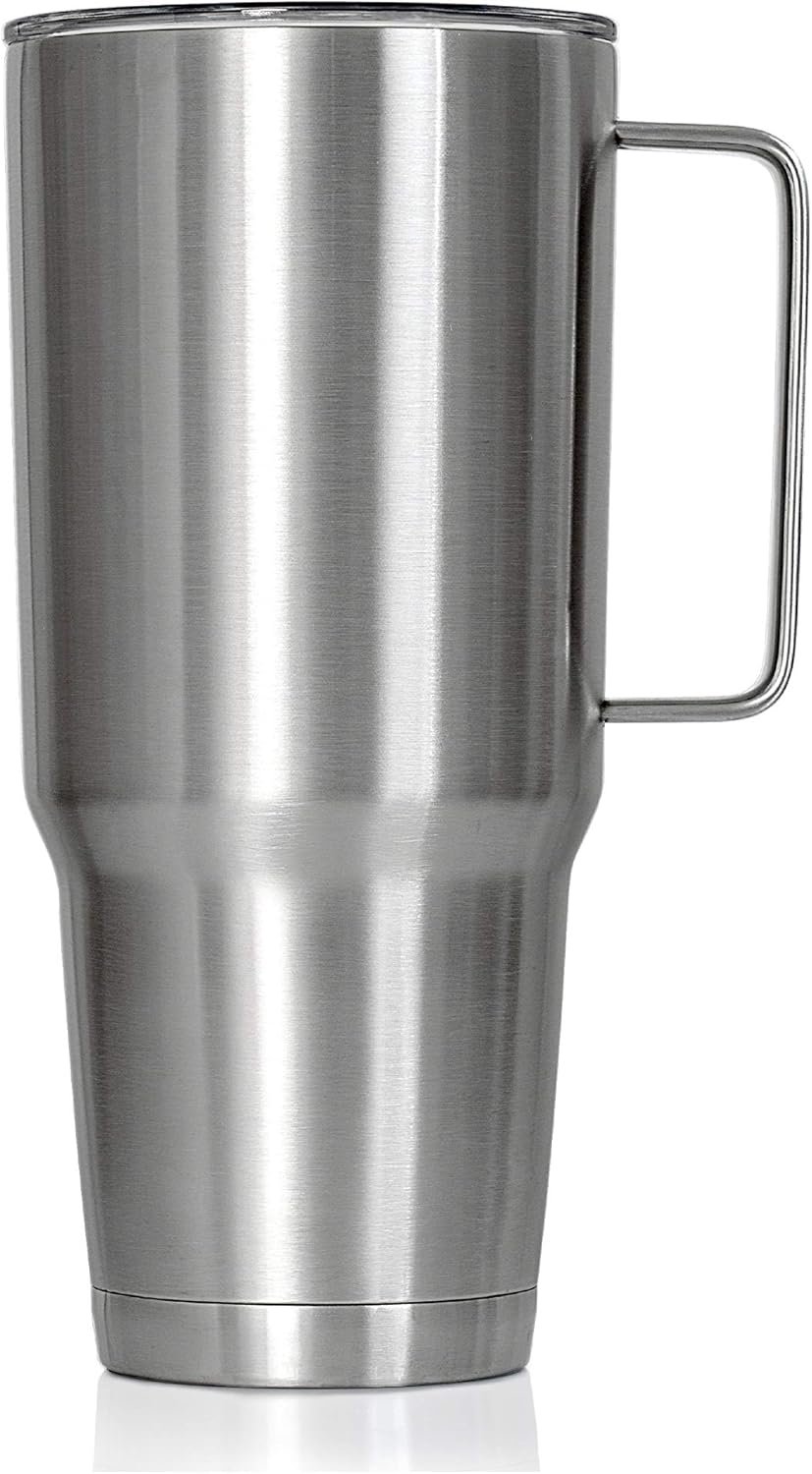 REFRESHING ENERGIZING CONVENIENCE: Featuring a stainless-steel finish, and a jam dropping 8-cup capacity and a tight spill-preventing lid, this massive 10″-tall traveling beverage cup weighs 1.45 lbs. and fits in the front cup holders of most full-size cars and trucks. THE BASE FITS IN A 4″ WIDE BEVERAGE HOLDER.
