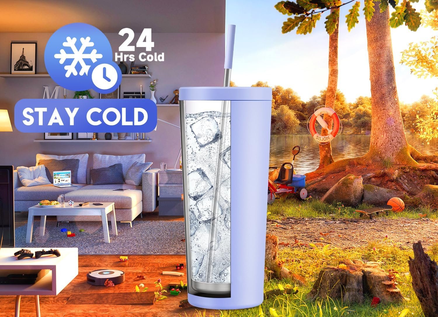 KEEPS COLD. With double-wall vacuum insulation, Meoky stainless steel tumbler with lid and straw stays cold for 24 hours.