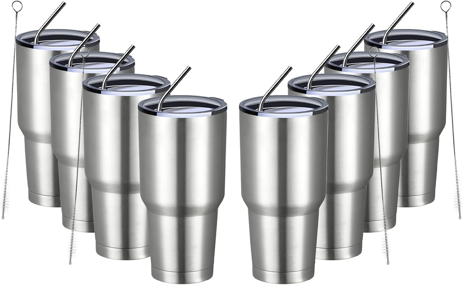 MEWAY 30oz Insulated Tumbler With Lids and Straws,Stainless Steel Double Vacuum Coffee Tumbler Cup, Brush, Durable Powder Coated Coffee Cup for Cold & Hot Drinks, Office, Travel(Silver,8 PACK)