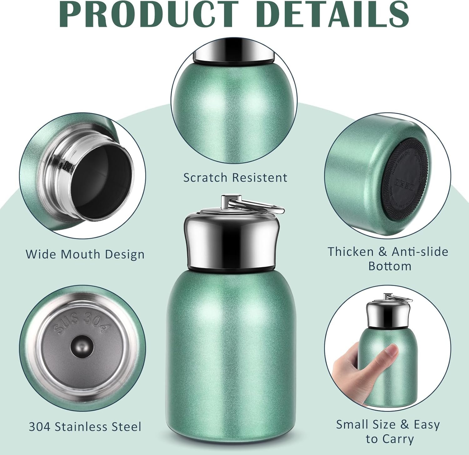 Small and Portable: the small body can contain 300ml capacity (5.5 x 2.8 x 2.2 inches), so even toddlers can easily hold this compact water bottle for trouble free drinking; The compact water bottle fits snugly inside handbags and lunch bags, which would not leak or spill when go out, always add moisture for you