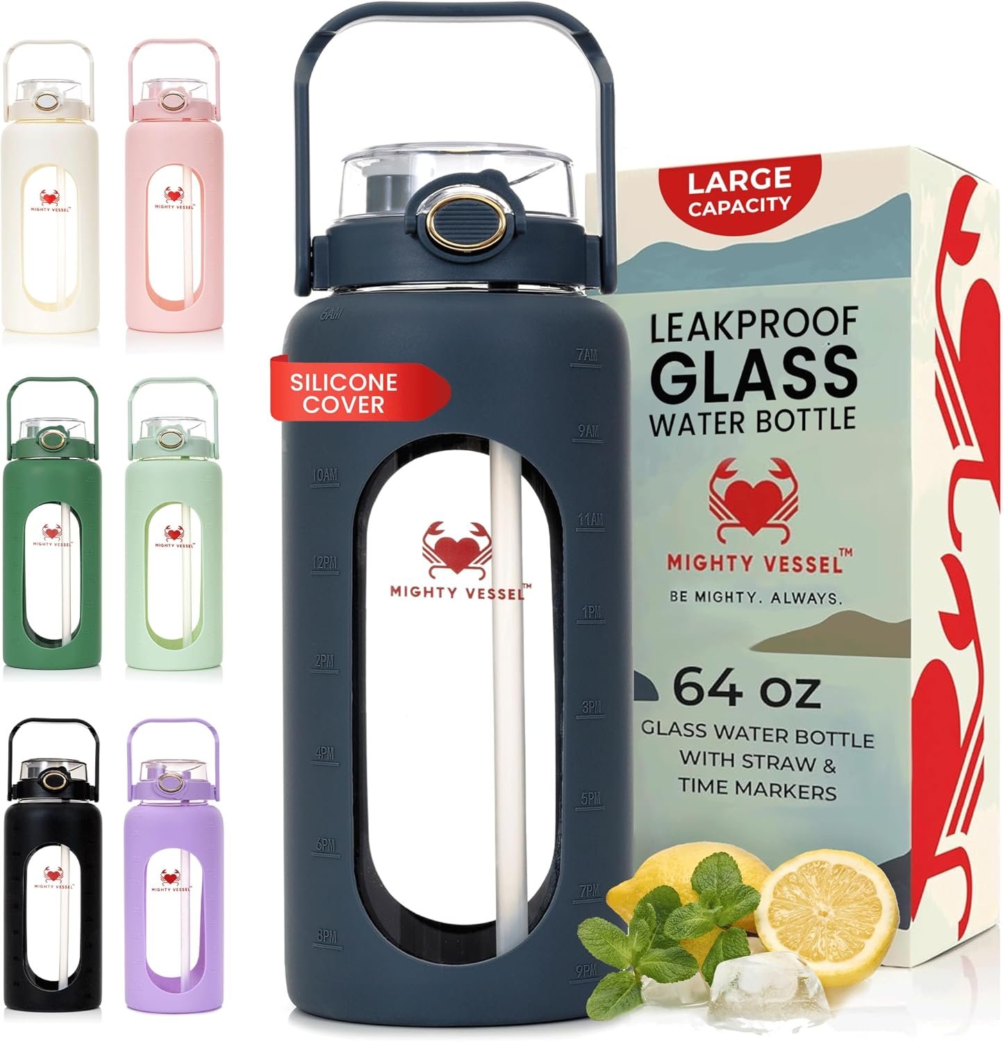 MIGHTY VESSEL 64 oz Glass Water Bottle – Dark Blue | Large Borosilicate Glass Jug with Straw & Time Marker – Leakproof, Travel-Ready Hydration for Sports, Gym, Daily Use