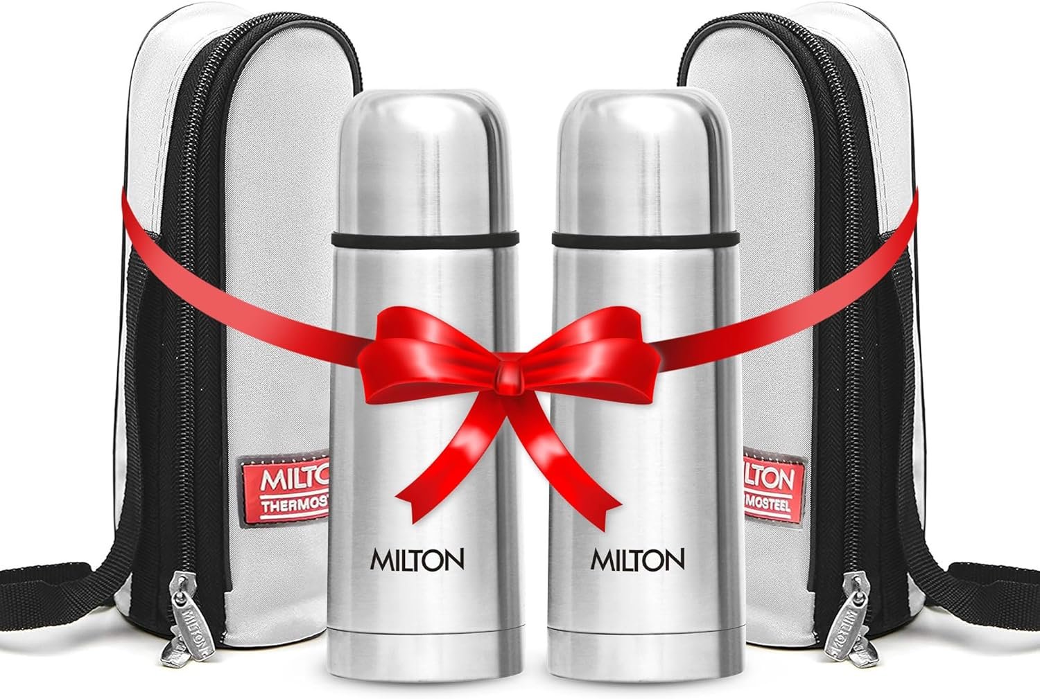 Milton Small Vacuum Flask for Hot Drink 350 ml (12 oz), Stainless Steel Double Walled Insulated Water Bottle for 24 Hour Hot and Cold Drinks, Leak proof, BPA Free,Thermosteel Flip Lid Set of -2