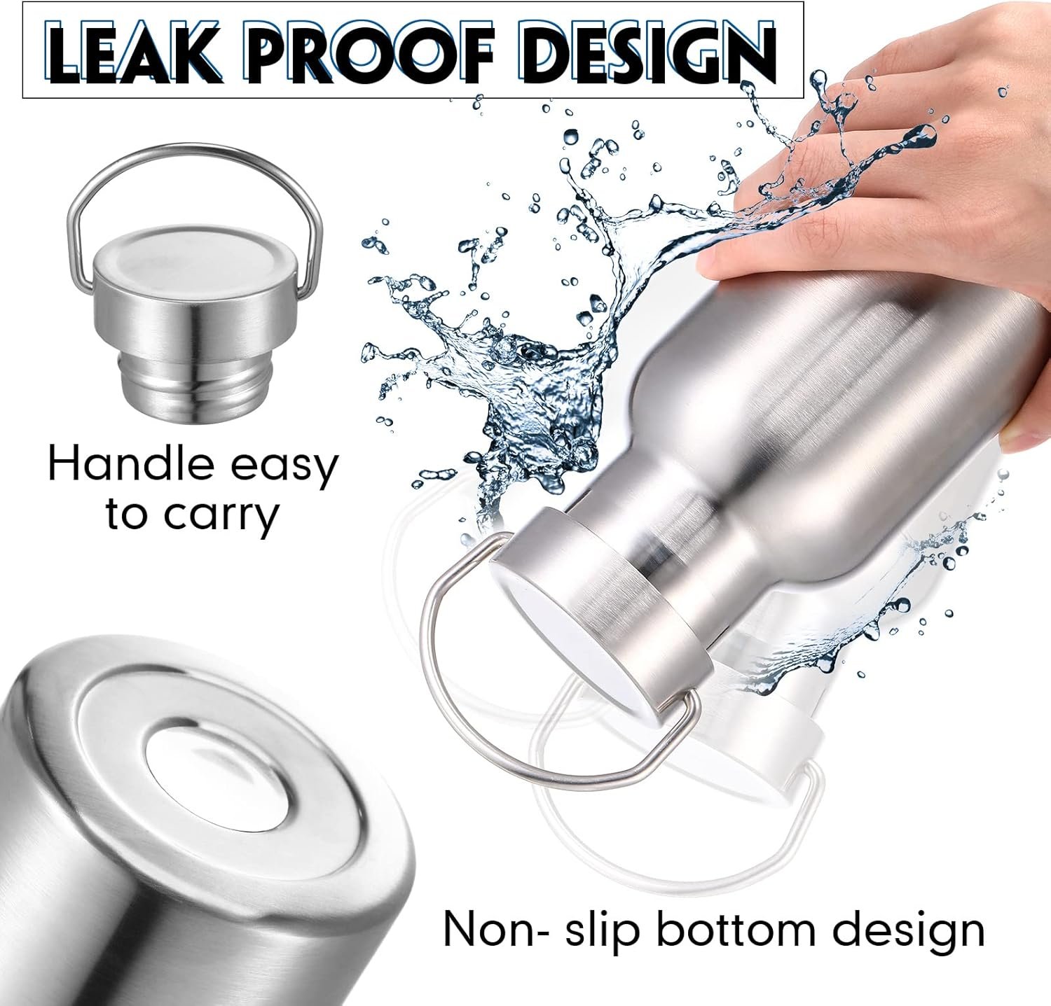 Sports water bottle with handle is made with double wall insulation, which can keep beverages cold or warm and the outer wall is not easy to sweat. This double wall vacuum insulated stainless steel bottle lets you enjoy cold drink.