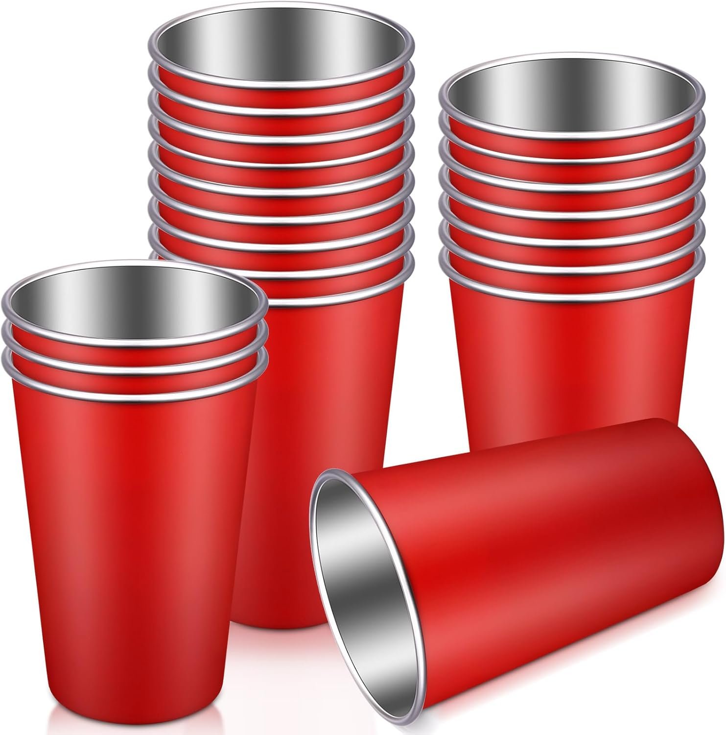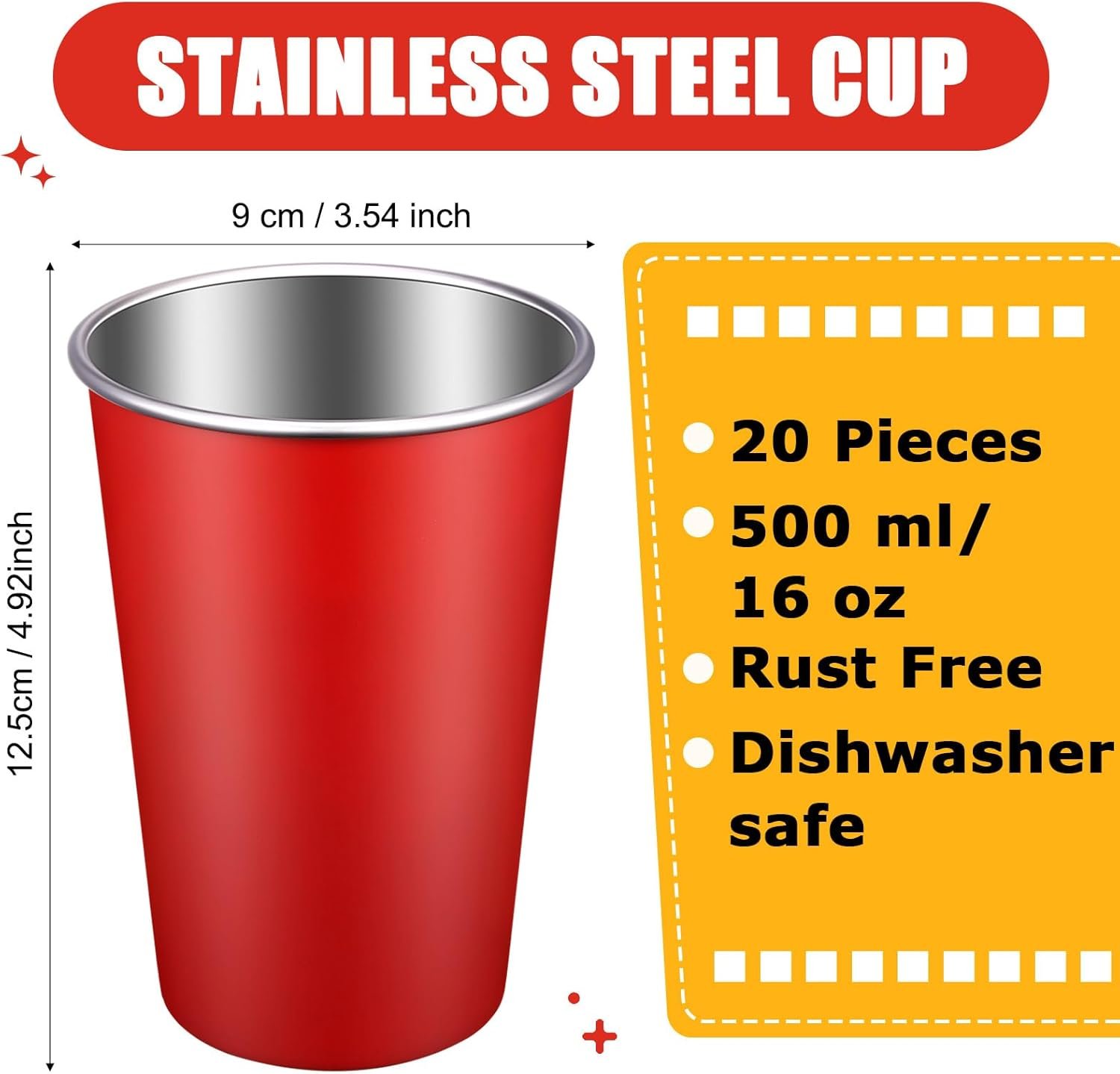 Mimorou 20 Pack 16 oz Stainless Steel Pint Cups Metal Cups Unbreakable Drinking Water Tumblers Stackable tumbler for Adults Bar Home Restaurant Travel Picnic Camping Outdoor(Red)