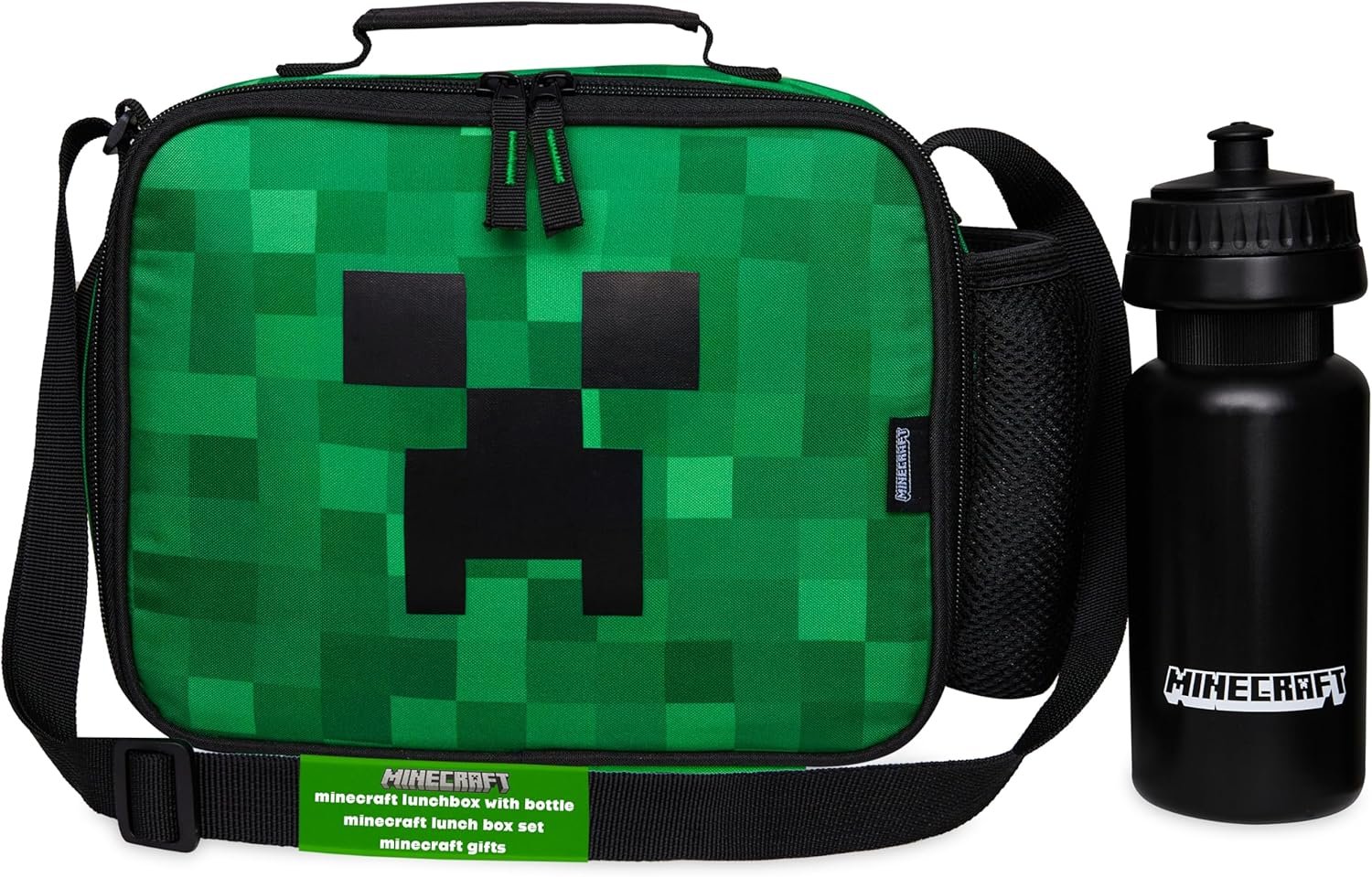 Minecraft Lunch Bag for Kids – Choose from iconic Creeper designs. Options include a version with a water bottle or an insulated lunch box for snacks, perfect for outings, trips, or picnics.