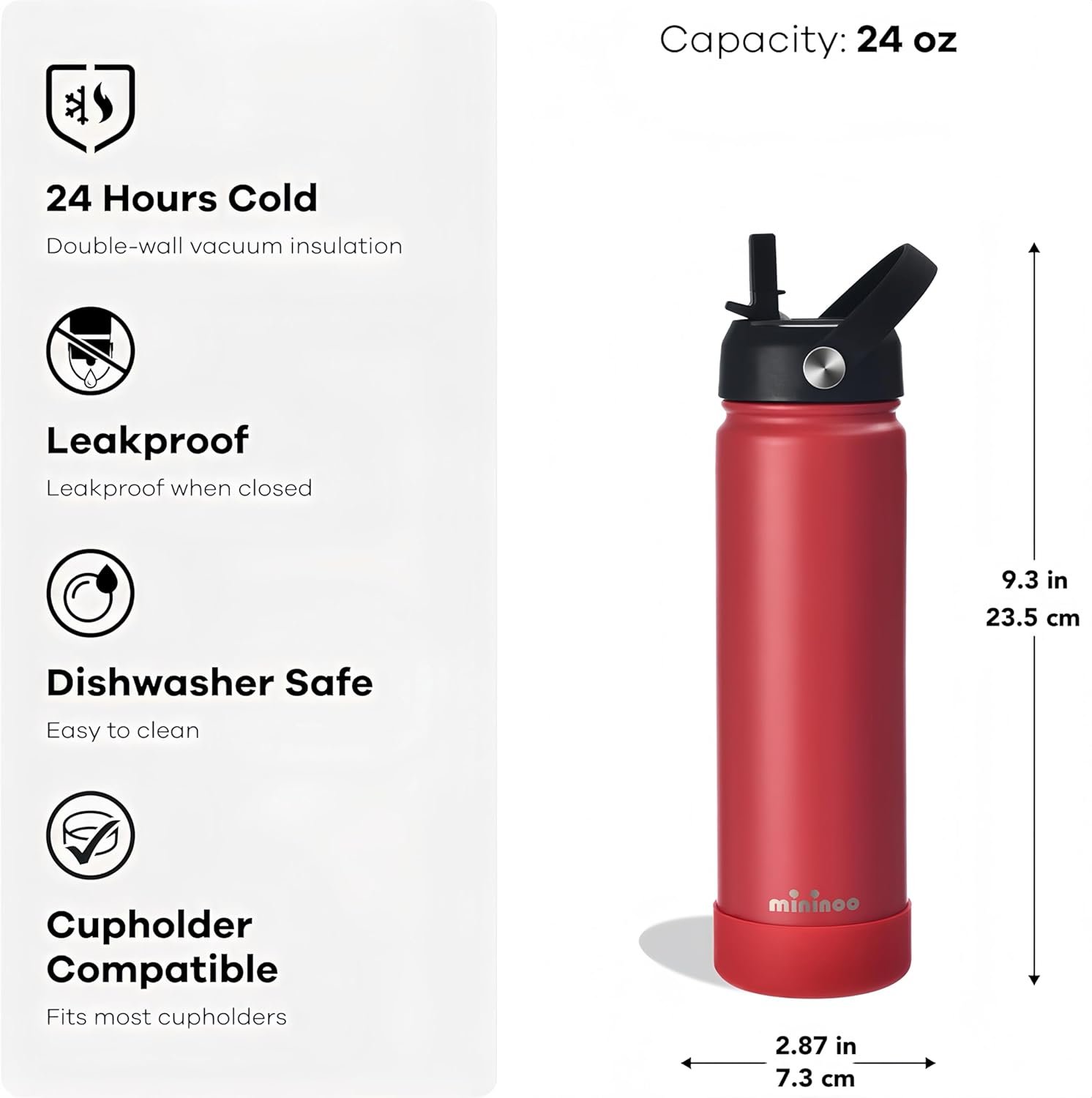 mininoo Insulated Stainless Steel Water Bottle with Straw and Lid for Sports, 24 oz, Red