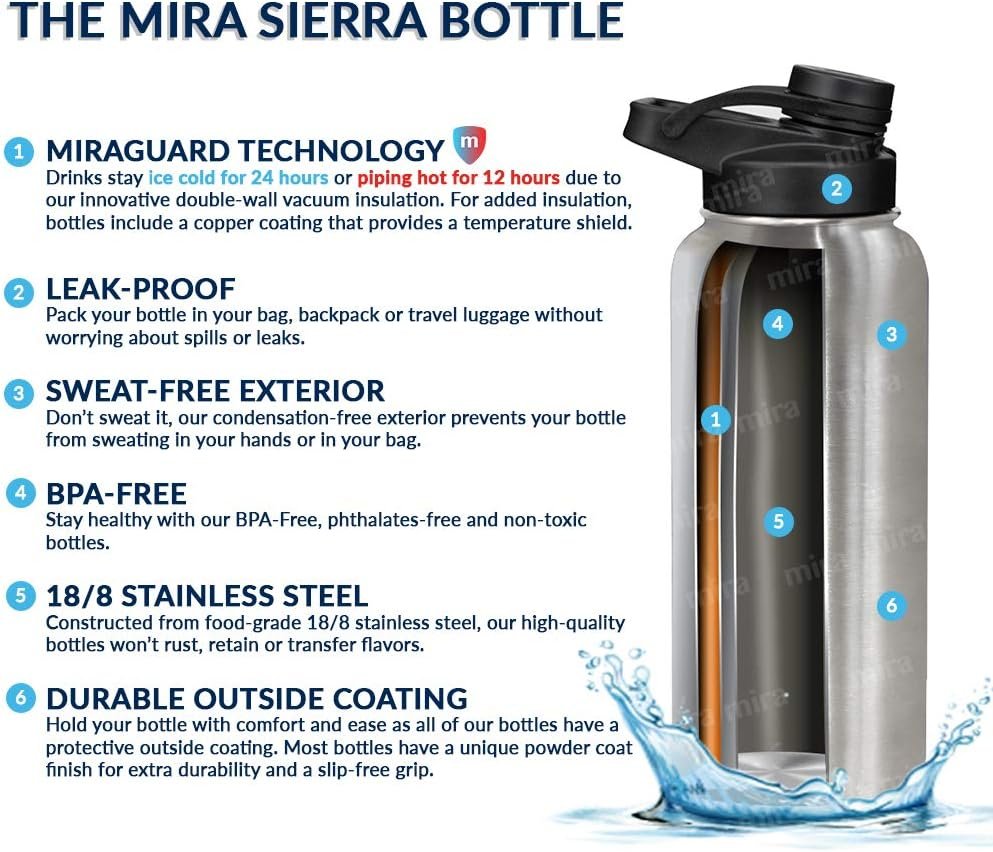 Innovative Vacuum Insulation: Our highly rated insulated water bottle uses our MiraGuard Technology to keep drinks ice cold for 24 hours or piping hot for 12 hours. With our double-wall vacuum insulation technology, your thermo water bottle maintains inside temperatures for hours and prevents condensation from forming on the bottle’s exterior.