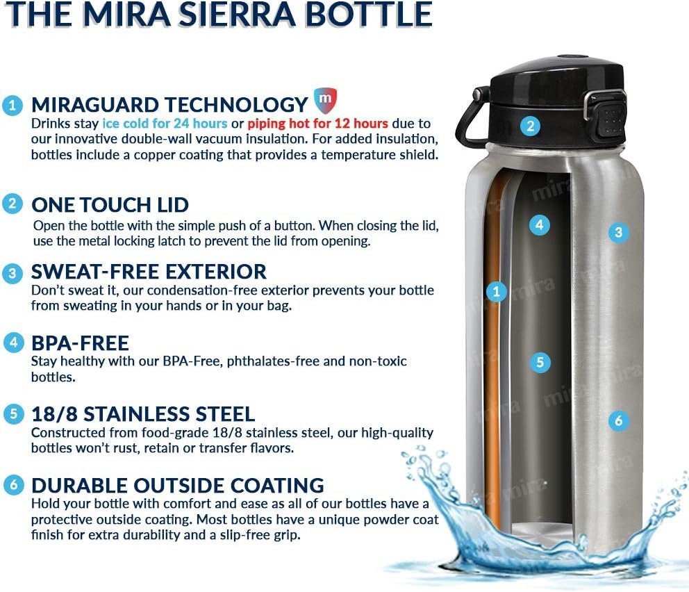 Innovative Vacuum Insulation: With our MiraGuard Technology, drinks stay ice cold for 24 hours or piping hot for 12 hours. Our highly rated insulated thermo water bottle protects hands from inside temperatures and provides a condensation free exterior.
