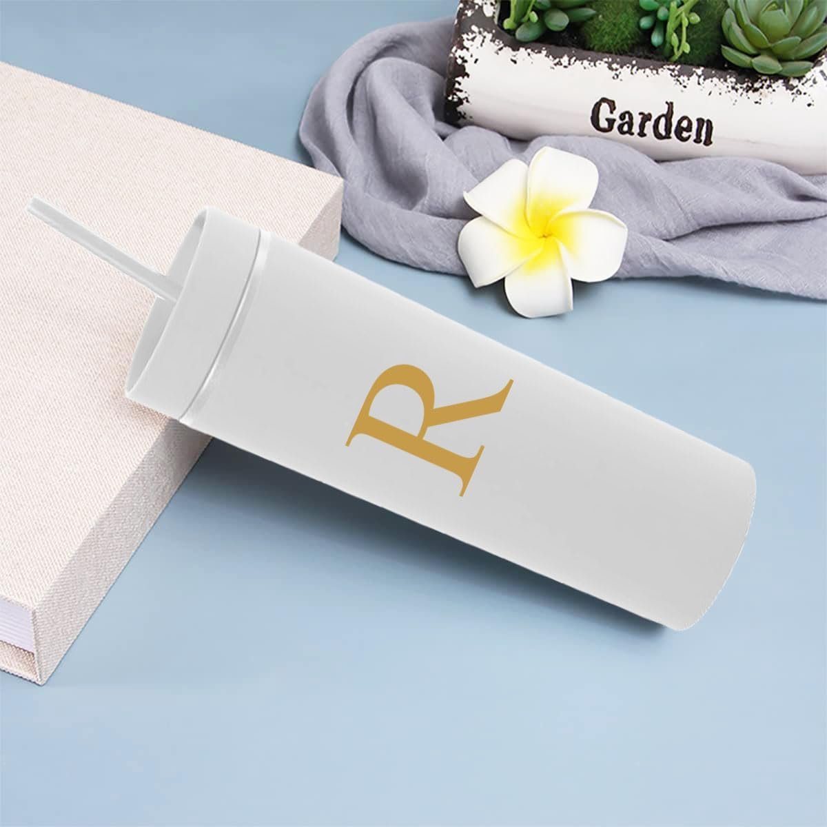 momocici Personalized 16 oz Initial White Matte Skinny Tumbler with Lid and Straw.Customized Letter R Slim Monogrammed Tumbler.Double Walled Plastic Cup for Smoothie Tea Iced Coffee.