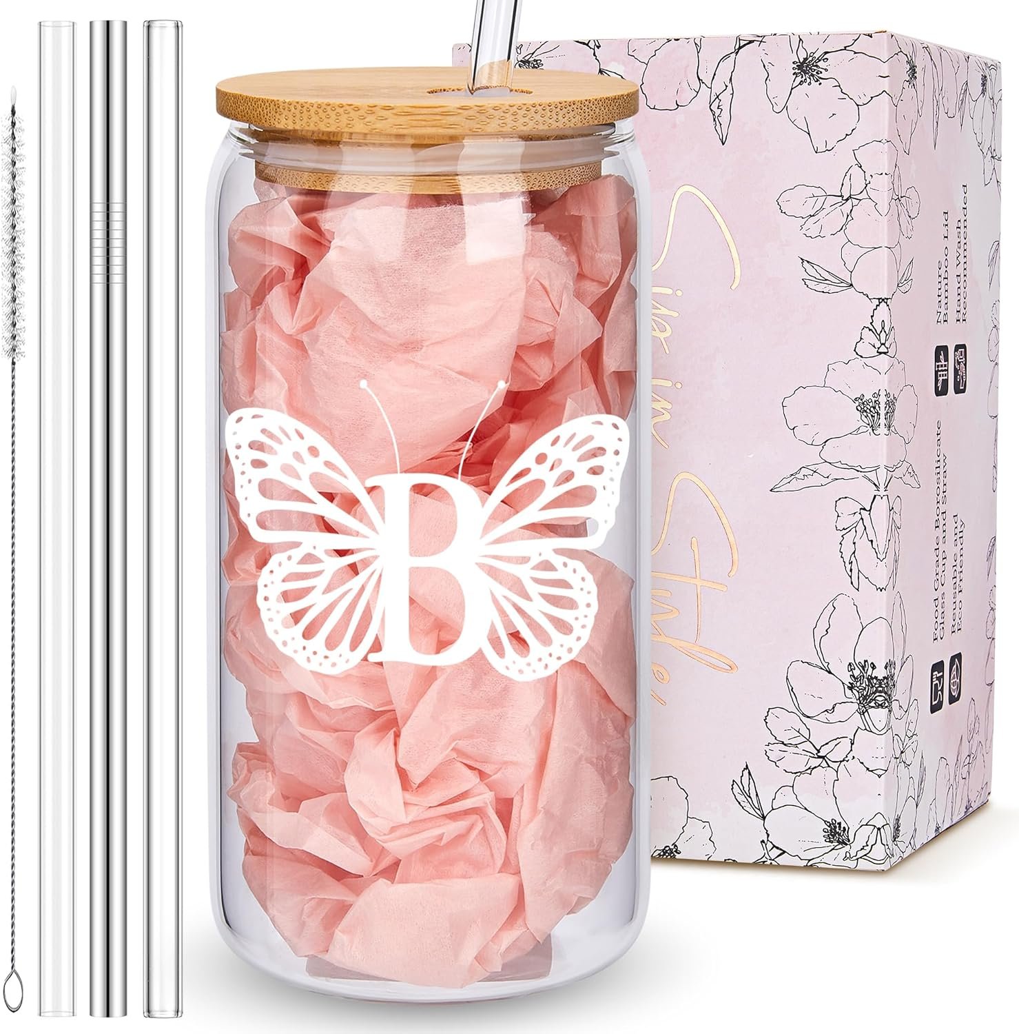 Monogrammed Butterfly Gifts for Women, Cute Personalized Glass Cups with Lids and Straws, Customized Initial Iced Coffee Cup Drinking Mug Tumbler, Unique Gifts for Women Mom Who Have Everything, B