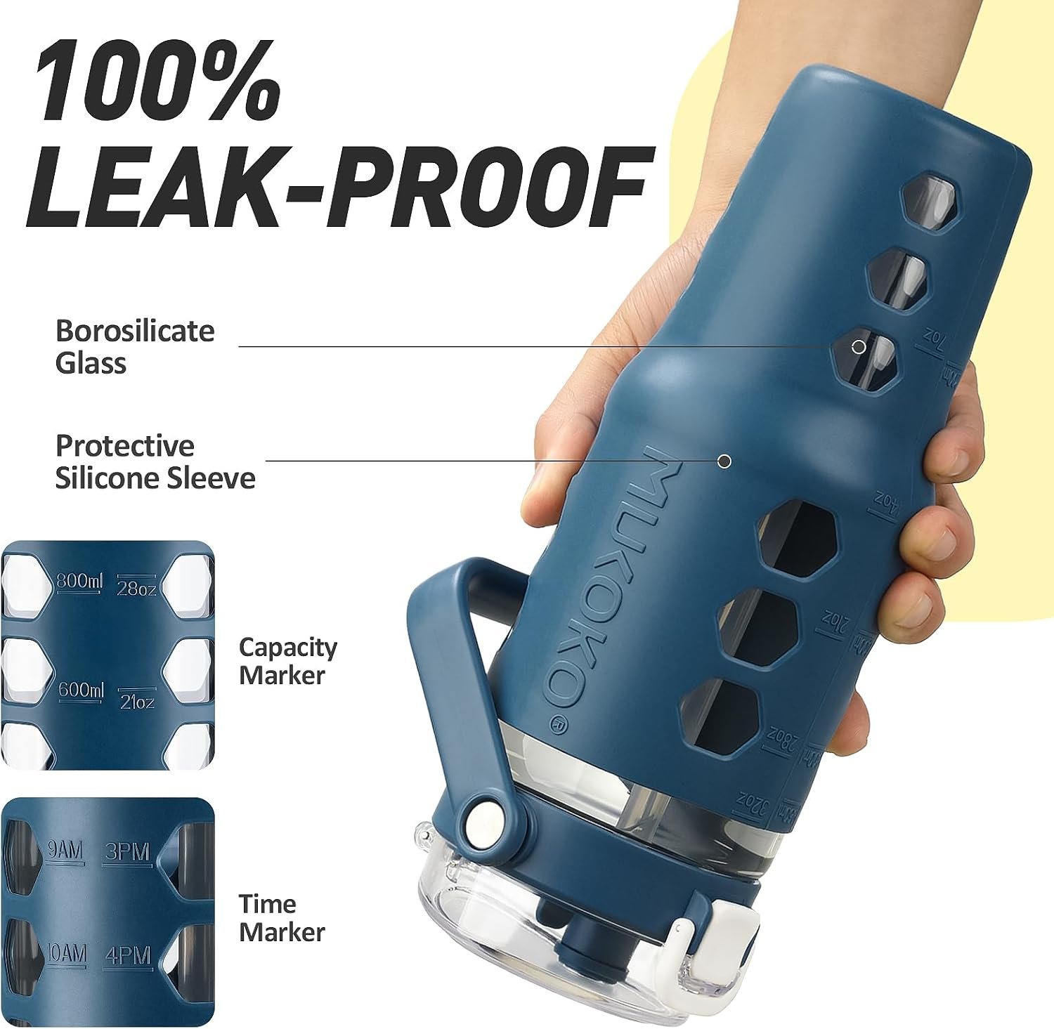 GLASS WATER BOTTLES WITH TIME TO DRINK:MUKOKO 1 liter waterbottle with time marker preserves the purity of water. This is a very handy way to keep up with water intake,stay hydrated and healthy. It’s a great gift to have. They are great for home, work, and travel. The glass cup is a perfect gift for your family, friends, love ones, and also a perfect gift during ceremonies like Christmas or during mother’s, father’s day, or can offer as a birthday gift.