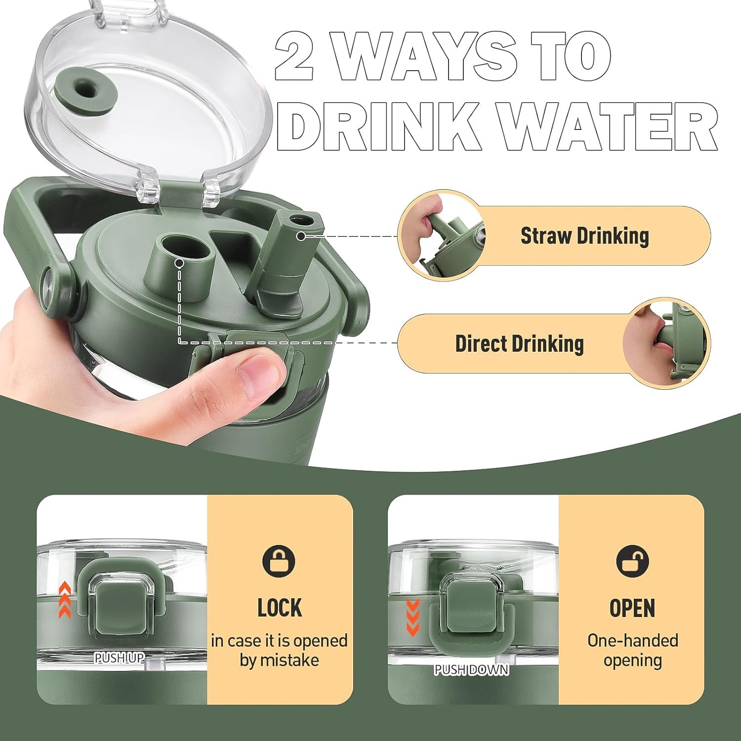 2-in-1 LID:The sport bottle enables two ways to drink water with convenient 2-in-1lid.Spillproof sipping with build-in flip straw or direct drink through chug mouth.Perfect for on the go.
